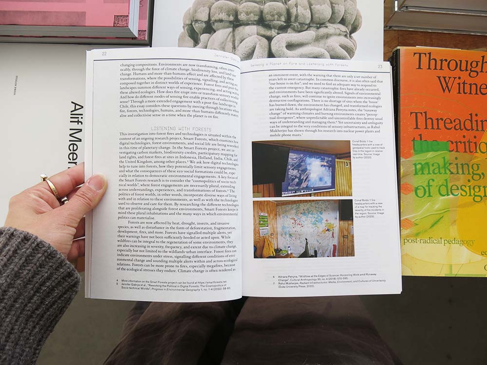 Common Sensing brings together practitioners and thinkers whose work engages with the relationships between different modes of sensing environmental conditions and the role of sense-making in producing collective claims and forms of resistance. Contributions move across a diverse set of contexts: from managing forest fires in China Muerta, Chile, replanting sabr, a prickly pear cactus in Palestine, the cultivation of peasant seeds by farmers in southern Italy, to communal walking projects in the settlements of Karachi and grass roots campaigns opposing geothermal energy production in Turkey. Contributions also explore how these everyday ‘common sense’ responses to local conditions operate alongside more technical forms of sensing, including X-ray imaging, satellite monitoring, ground penetrating radar, bio-acoustic recording, and smart sensor technologies. How might a poly-perspectival set of methodologies and techniques enable the production of a new ‘sensory commons’ that is grounded in an ethics of care and guided by a planetary sense of communal well-being?