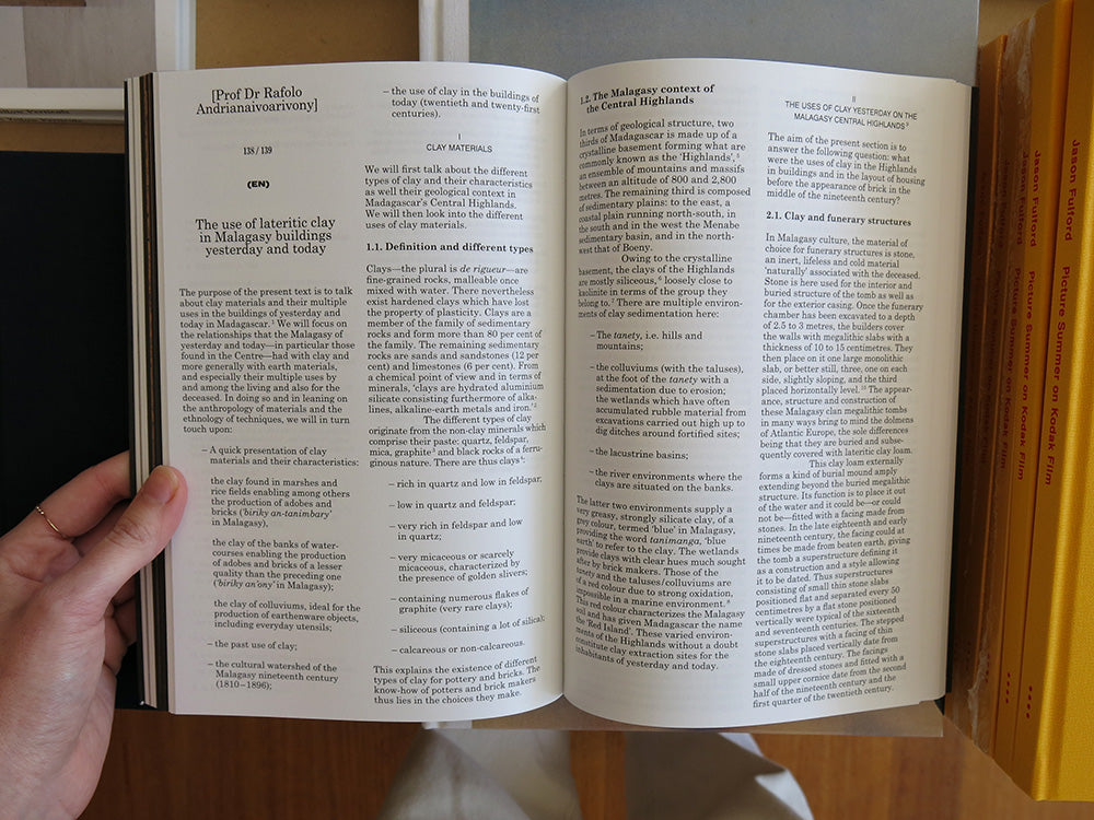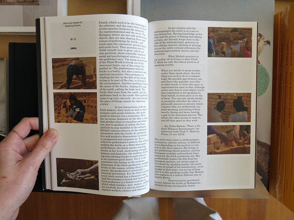 Piles of Bricks / Piles de briques by Bie Michels presents the working process of her project ‘Bricks in Madagascar’. This project consists of two films, ‘La couleur de la brique’ and ‘Ingahy Kama’, the installation ‘Circular construction versus human body—referring to Toshikatsu Endo’, which she showed in Madagascar (October 2017) and Argos Brussels (May 2018), and the performance ‘Piles of bricks (working process)’, on which she will work 8 weeks before the book presentation and which will be performed at that moment.