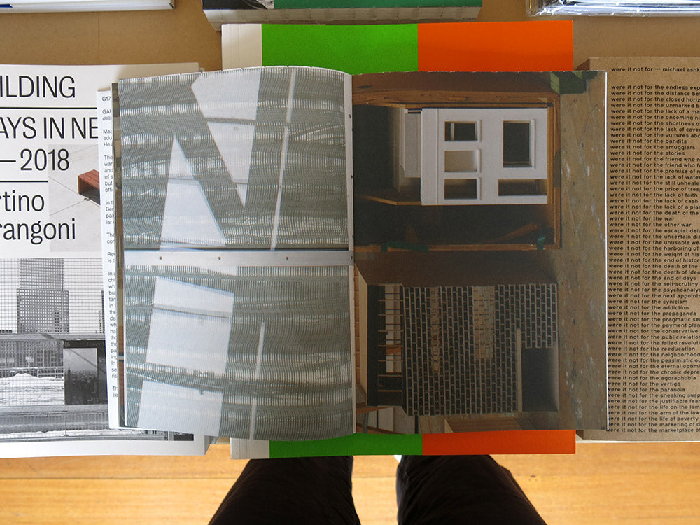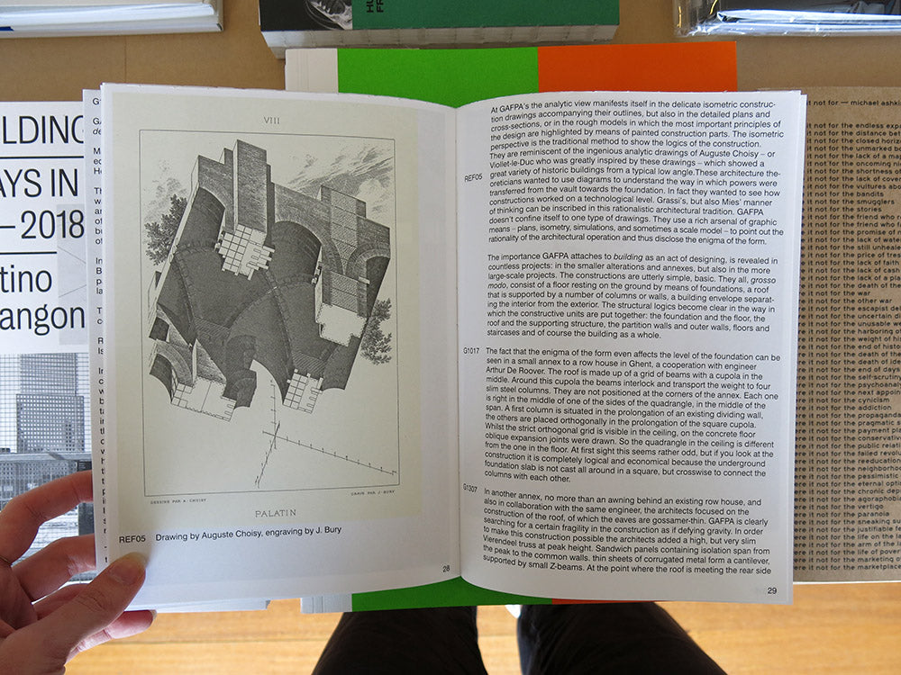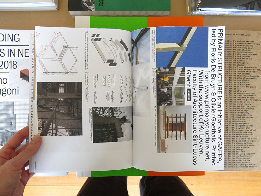 The first contribution is a text written by architecture critic Maarten Van Den Driessche about the work of GAFPA of the last ten years. The second contribution contains pictures of their studio made by Aglaia Konrad including fragments of the making process. The third contribution is from Bert Huyghe. As a painter he contributed a text, illustrated by some of his paintings. The fourth contribution is a selection of research done over the past three years by students in the PRIMARY STRUCTURE studio which GAFPA teach with Olivier Goethals at the KU Leuven Faculty of architecture Ghent. Printed from the blog primarystructure.net.
