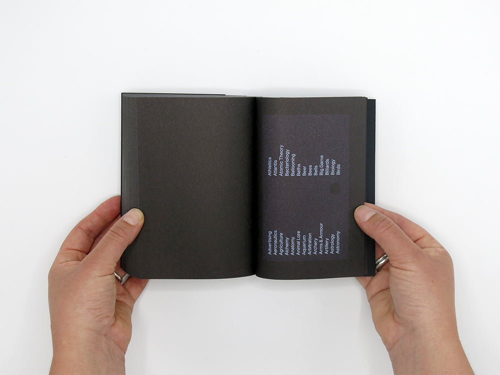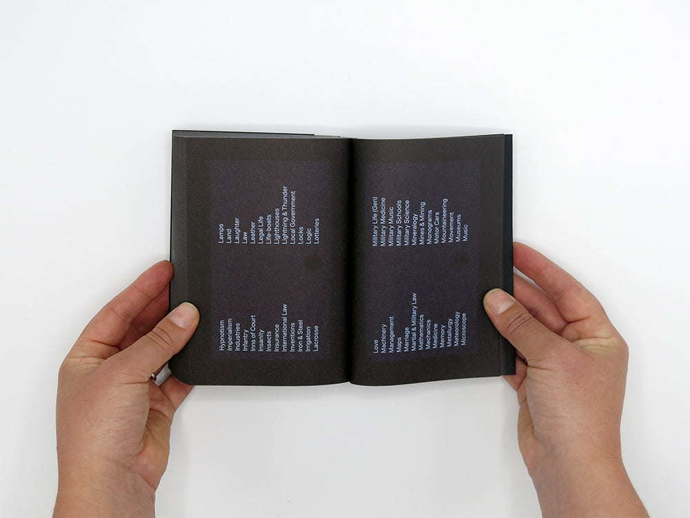 Search Engine – of which this book is a reproduction – is a series of ‘catalogue cards’ featuring photographs sourced from the London Library, one of the world’s largest independent lending libraries. These images are ordered as the London-based artist, Louis Porter, encountered them – alphabetically by subject – on shelves that make neighbours of Sleep and Smuggling and bring together Pleasure, Poaching, and Poisons. The result forms an archaeological exploration of the systems of knowledge that we often take for granted.