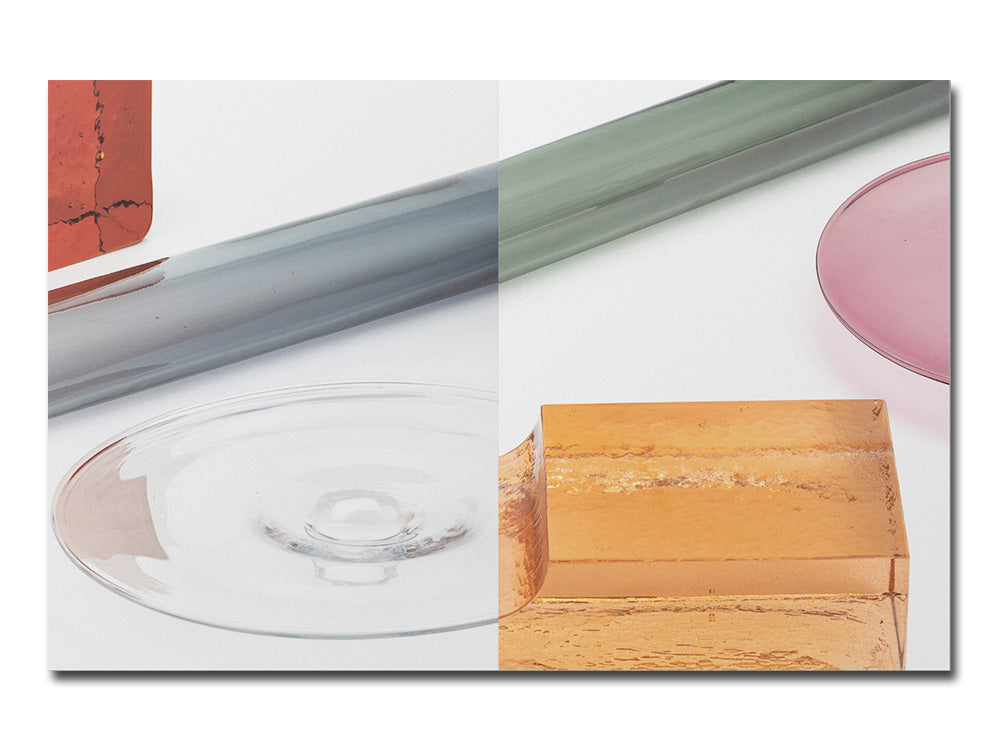 Produced in Murano, in collaboration with the Maestro glassblower Simone Cenedese, each vase is composed of four elements: two blocks of cast glass (in four different sizes and two different thicknesses – 6 or 7 centimetres), a blown glass tube (in two different heights), and a small shallow blown glass dish that can be stacked on top of the tube. Each element is of a different shade, picked from an eleven-colour palette.