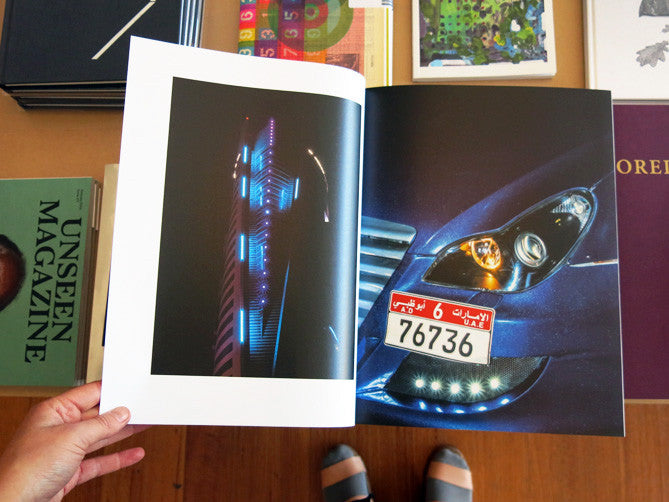 Fully Fuelled brings together pictures taken from 2012 to 2014 by the young French photographer Basile Mookherjee, who documented young Emiratis’ nights out and the United Arab Emirates’ 42nd national holiday on the streets of Dubai and Abu Dhabi. Flat, sprawled-out urban deserts, phallic urban geometries, reflecting surfaces and lavish ornamentation form the décor. The secret stars of these photographs are of course the cars, and the view seldom rises above windshield level. The human subjects, traditionally dressed in dishdasha (for men) and abaya (for women), seem as though photographed “through the lens of the car,” as the photographer puts it. Fully Fuelled is an over-the-top liturgy composed of the shapes and surfaces of our globalized environment. The book also reflects on the UAE’s abrupt petrodollar-driven modernization and the aesthetic expression thereof in cities that have sprung up amid an essentially nomadic Middle Eastern culture. A world somewhere between desert dust and Gotham City, Islam and spending power, tradition and modernity. Published by Edition Patrick Frey (Zurich).