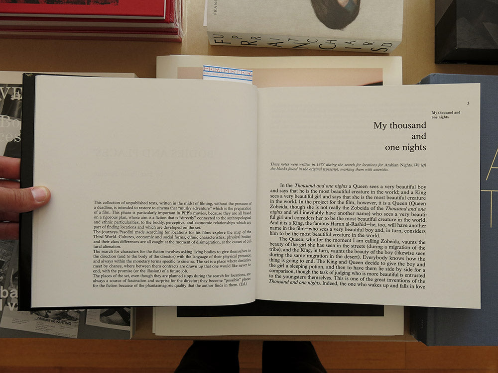 In 1980 in Rome, a small cooperative around film critics Michele Mancini and Giuseppe Perrella produced a 600-page book of black-and-white photographs entitled Pier Paolo Pasolini: Corpi e Luoghi, dedicated to the work of Italian director, poet and writer Pier Paolo Pasolini. With its relentless and playful classification of some 2,000 film stills arranged under the categories “bodies” and “places”, quotation here is understood as a form of “appropriation”, as a practical use of an archive.