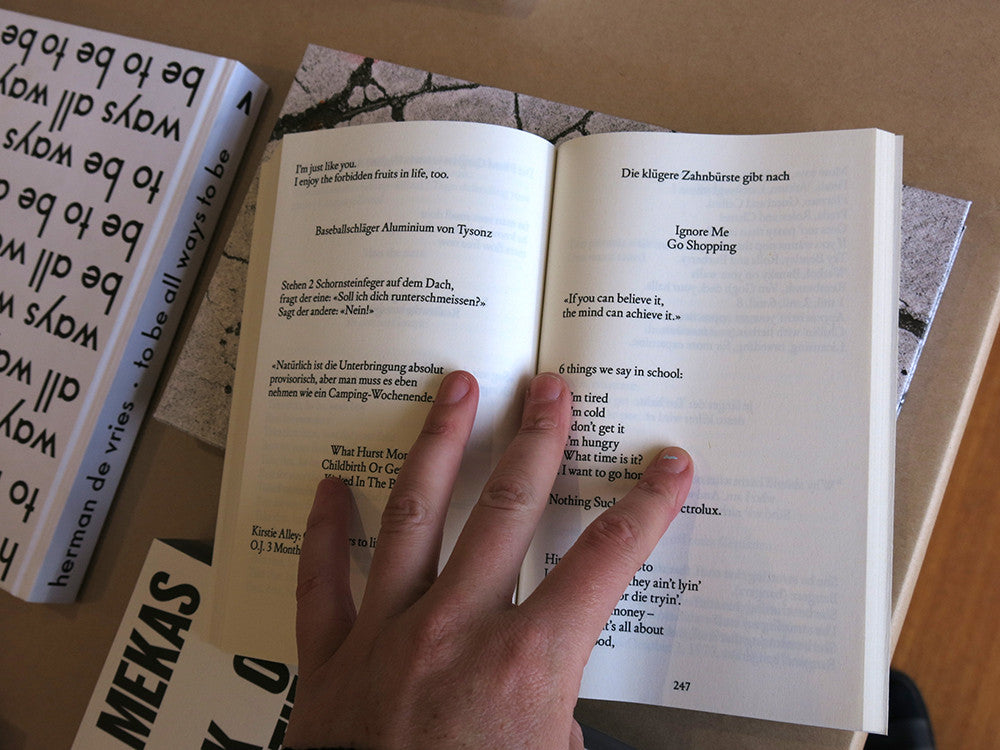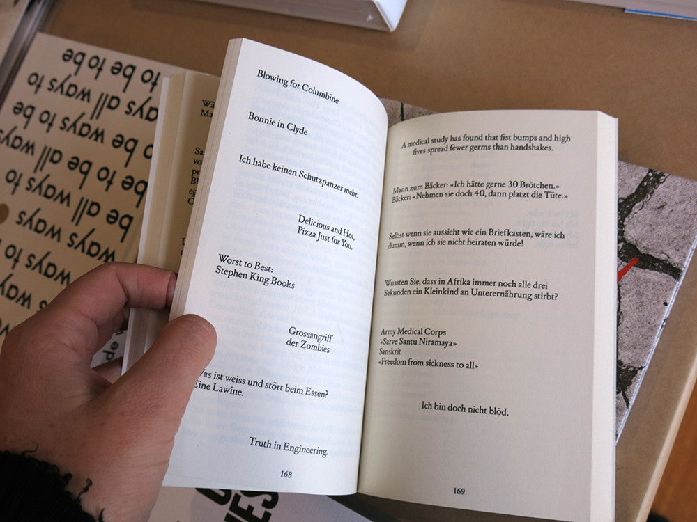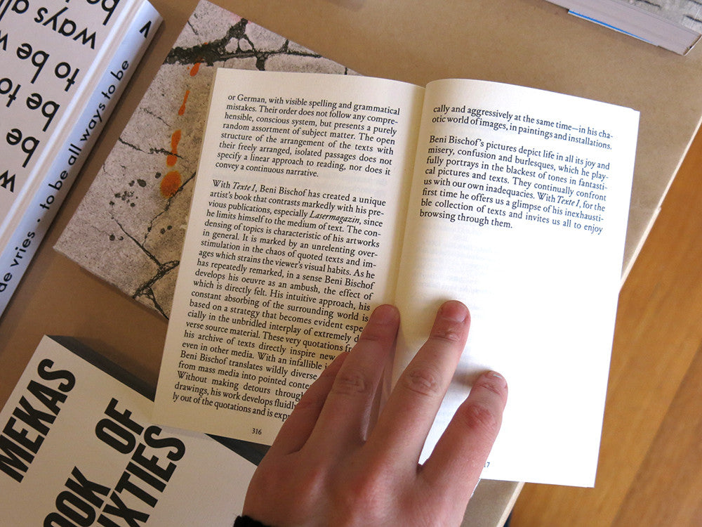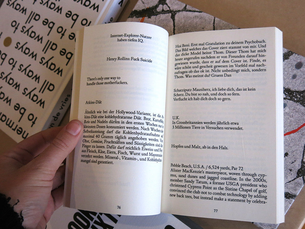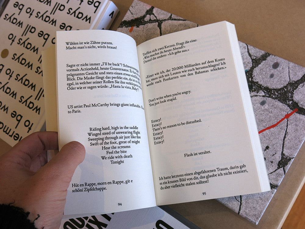 Beni Bischof works in an unruly and intuitive manner. In addition to his drawings, collages, paintings, sculptures, and installations, his self-published, laser copied art magazine has since 2005 borne witness to his eruptive creative urges. He translates spontaneous ideas concerning social and political issues into quirky, humorous word and image-based messages of a disarming directness.The banality of everyday life is not spared any more than current political dramas. Beni Bischof de-glamorizes the noble appearance of purported exclusivity and draws a picture of society characterized by his unfathomable sense of humor. He draws his image and text materials from trivial literature, fashion magazines, advertising, and even the virtual world. Psychobuch (2014), his first publication with Edition Patrick Frey, is both an overview of this intensive production as well as a full-fledged artist’s book in its own right. Texte offers an initial view into his current work in progress: pure text in a paperback format. It consists of Beni Bischof’s personal portrayal of his collection of emails, headlines, slogans, and jokes. Texte is being published on the occasion of the artist’s solo show at the St. Gallen Art Museum (February 13–June 21, 2015). Beni Bischof was awarded the St. Gallen Manor Art Prize for the year 2015. Thanks to Edition Patrick Frey (Zurich).