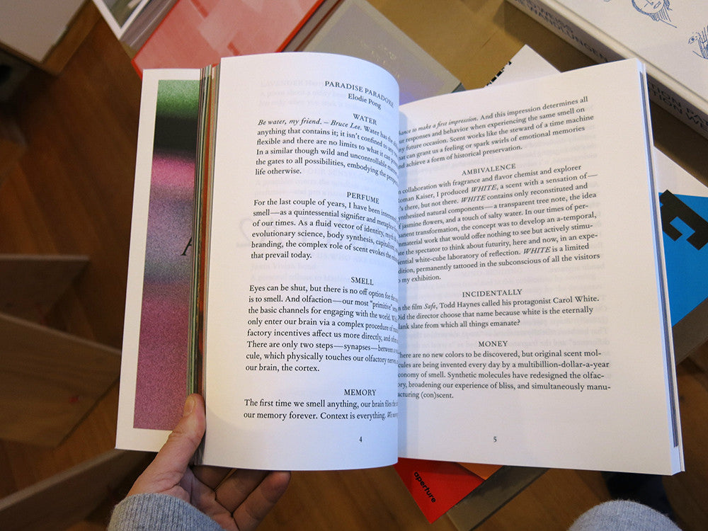 Eyes can be shut – but there is no off option for the nose. To breathe is to smell. And while visual stimuli only enter our brain via a complex process of neuronal translations, olfactory incentives affect us more directly – and often unbeknownst to us. The invisible architecture that surrounds us is the starting point of artist Elodie Pong’s project. She explores its numerous facets at an interface between fiction and reality, in both an exhibition at Helmhaus Zürich (March 11 to May 16, 2016) and in the space of this publication.
