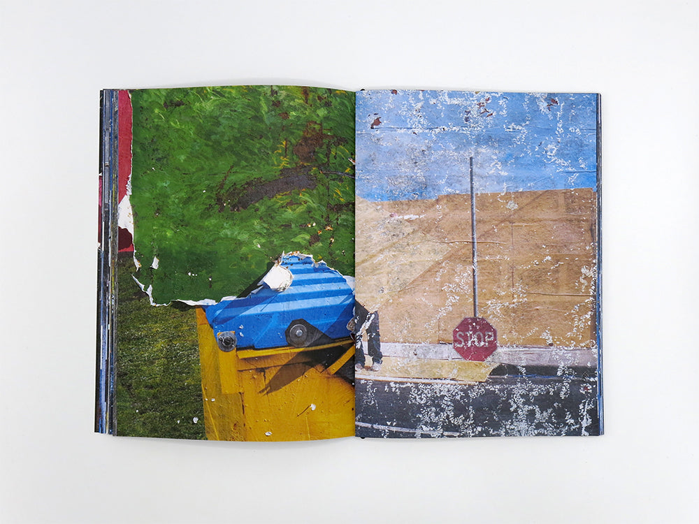 The book itself – Marlow’s first with Perimeter Editions – is presented in the form of a stack of wall-to-wall, full-bleed sheets, scored once down the middle, and unbound save for a cloth-wrapped elastic band. We experience these images as fragments, repetitions, textures, and tears. Their gritty fine-grain details, striking colour palette, and dynamic compositions are brought into vibrant conversation with one another across recto and verso pages, half of one image colliding and melding with half of another. It is only when we unbind the book block that we can witness each photograph in its entirety.