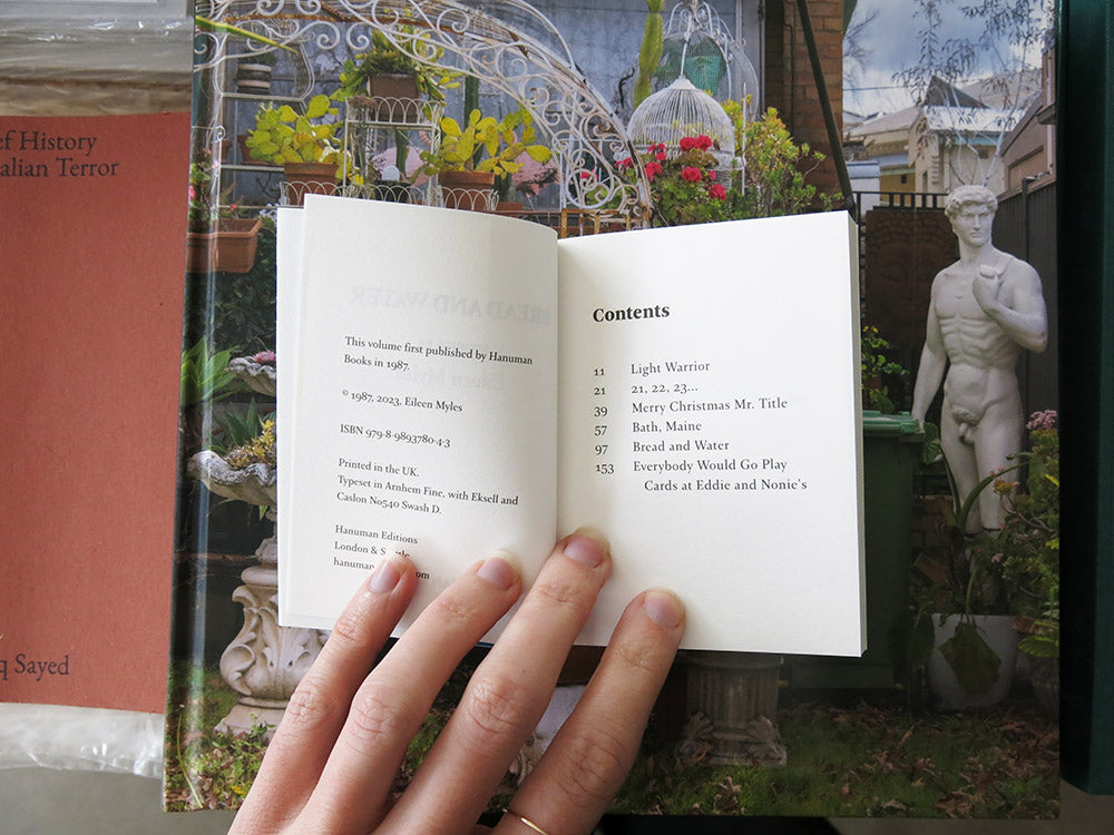 First published by Hanuman Books in 1986, Bread and Water is the debut short story collection by the renowned poet Eileen Myles, assembling six stories with an autobiographical flavor, of being a queer, working-class poet with a penchant for mischief. Stories include: 'Light Warrior', '21, 22, 23…', 'Merry Christmas Mr. Title', 'Bath, Maine', 'Bread and Water', and 'Everybody Would Go Play Cards at Eddie and Nonie's'.