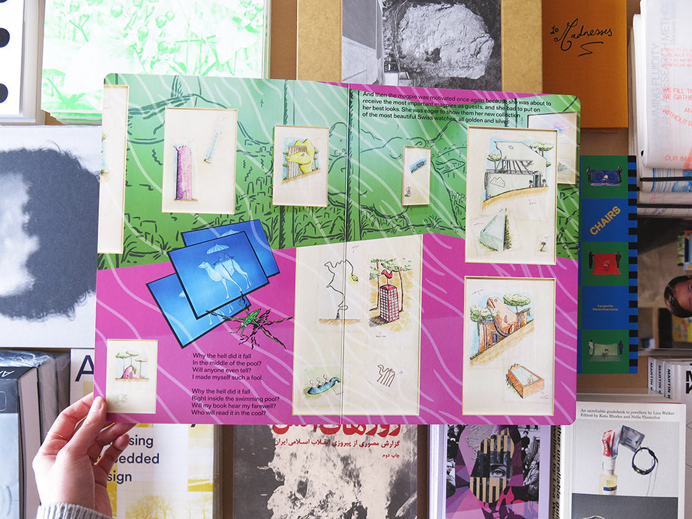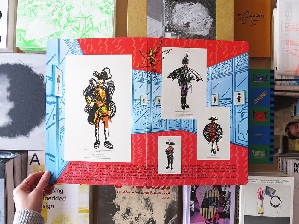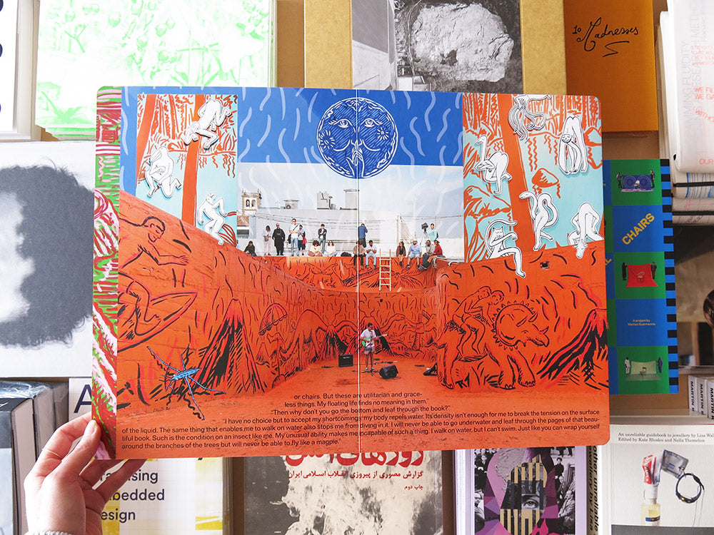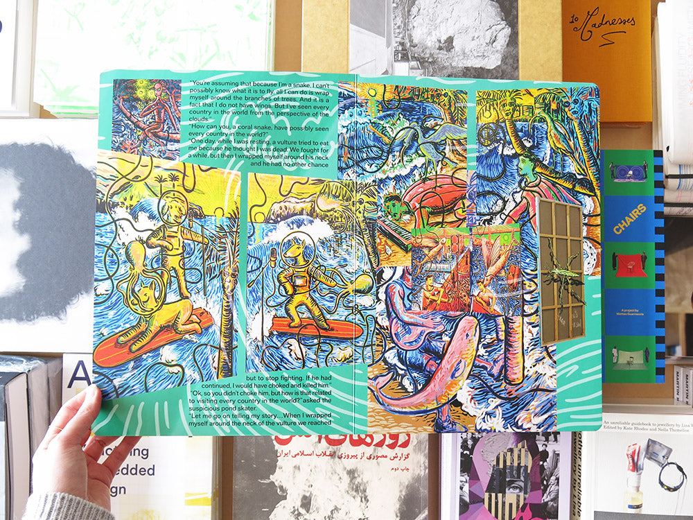 In that sense Lázaro Matos’ publication The Pond Skater occupies uncertain territory too, refracting and ensnaring the reader’s attention. The work offers a linear narrative, the fable of an insect and its encounter with a magpie and a snake. The Pond Skater observes the creatures around it, aloof and critical, but is entranced by a book the avaricious magpie drops in the pond; it can only observe it from afar until the snake unexpectedly and generously takes it to the bottom of the water. The tale floats over a background collated from works, installation shots and graphic shapes. The specifically located – though fantastical – story is untethered amid planes of different depth and feasibility. In a conversation between Lázaro Matos, João Mourão and Luís Silva that accompanies the publication, the artist speaks in terms of interlinked works that function like actors on a stage, speaking individually but in chorus.