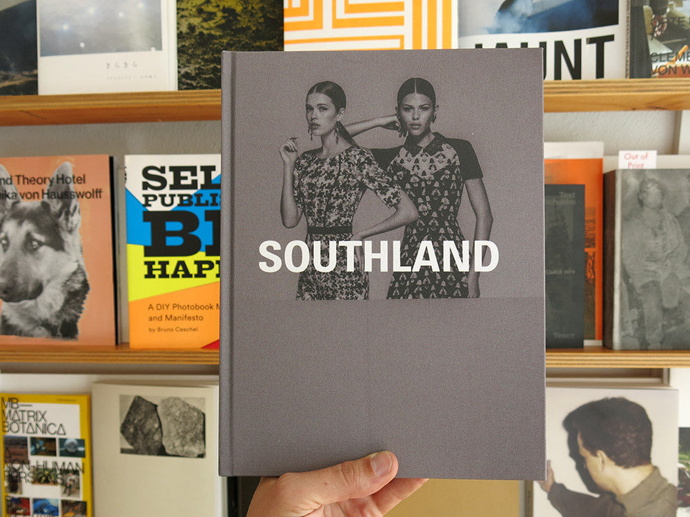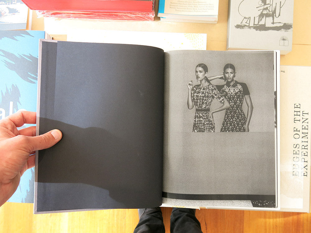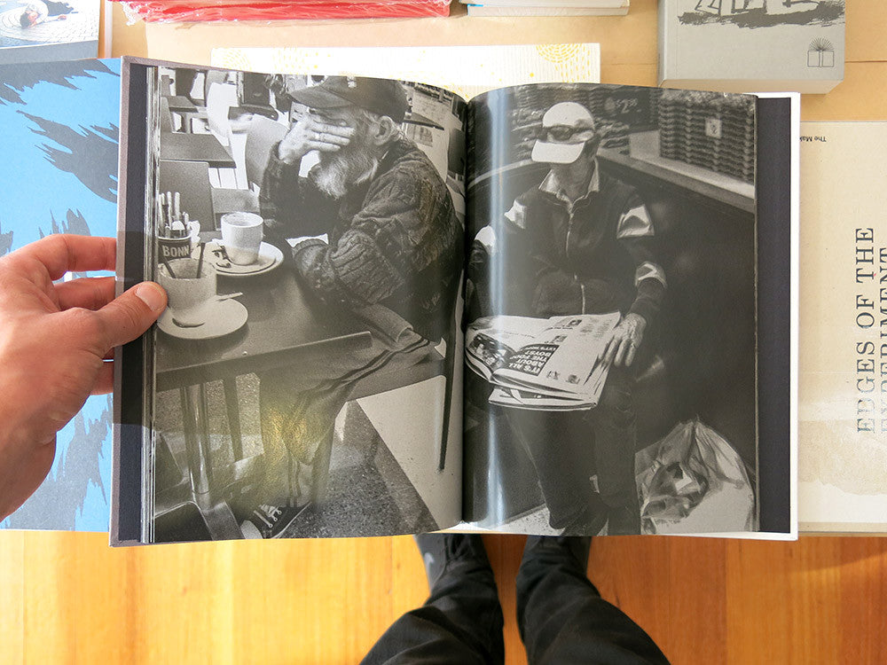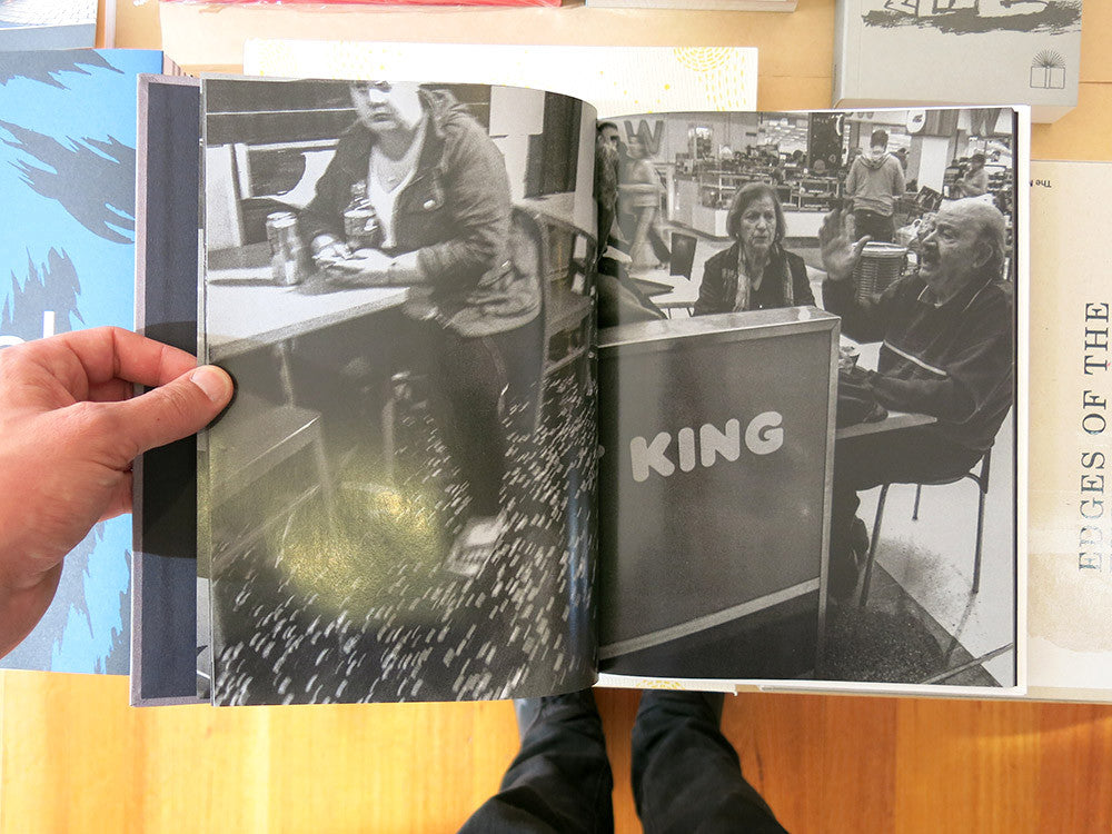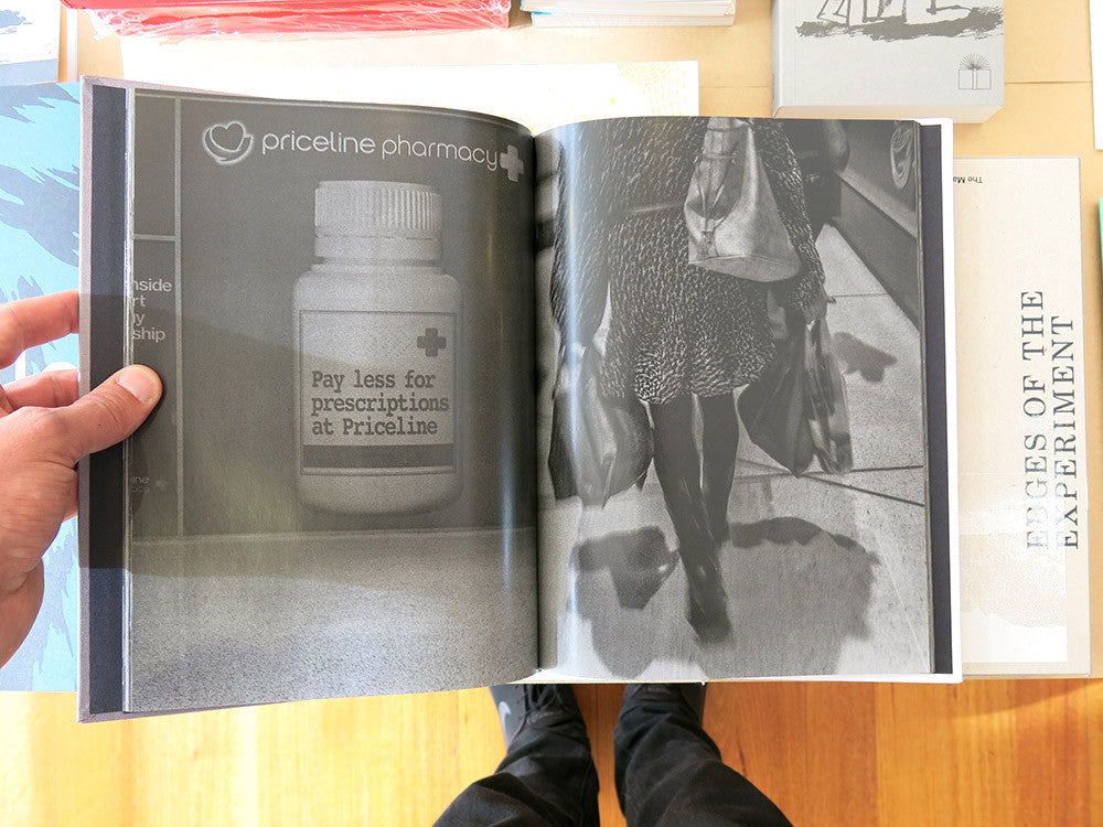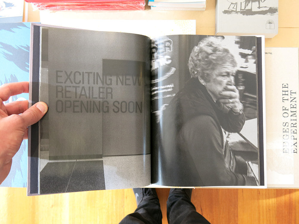 These photographs were taken by Yanni Florencenot on assignment but as an aside and as a participant in the weekly shopping trip to the SOUTHLAND shopping centre. A brightly lit and colourful place seen in dark, full bleed black and white photographs. Printed on thin glossy paper that references retail junk mail and contrastingly bound in hardback with the cover printed on textured cloth. The photographs depict advertising spruiking ‘infinite happiness’, ‘good life’, and ‘style guides’. But they show alienation, loneliness and anxiety. Nevertheless, through this appear people striving for community, under one roof; eating together, sitting together, walking together and being together. Trippy carpet patterns, blurred lights and endless mirrors alongside liver spots and crying babies. It’s a book about people versus architecture. Published by M.33 (Melbourne).