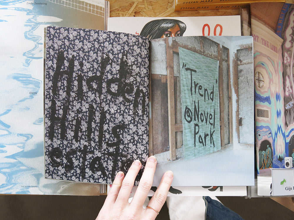 'The tract developments are emulations of utopian communities. Going back to the 1920’s utopian cult Kibbo Kift made banners that they took to specific locations of historic, mysterious monuments and natural monument occurances, Silbury Hill, Stonehenge. The real estate developments around Los Angeles are not mysterious but can be branded as such. An escape from the city life, with names that connote a natural preserve, such as Hidden Hills, Golden Valley, Garden Paradise Estates. Even though they all reside within the smog polluted skies that everyone in the Los Angeles basin does, they poke the desire for utopian living in nature, a simpler time. How to forget about technology, automation and the consequences of our hyper technological age. The signage is placed outside the entrance like the banners of Kibbo Kift, which they would make and bring ceremoniously to these natural or historic places. If one meditates on it maybe it will become real, transposing the desire for escape and living unfettered in paradise, 'getting back to the garden...' as Joni Mitchell would say.' – Kim Gordon