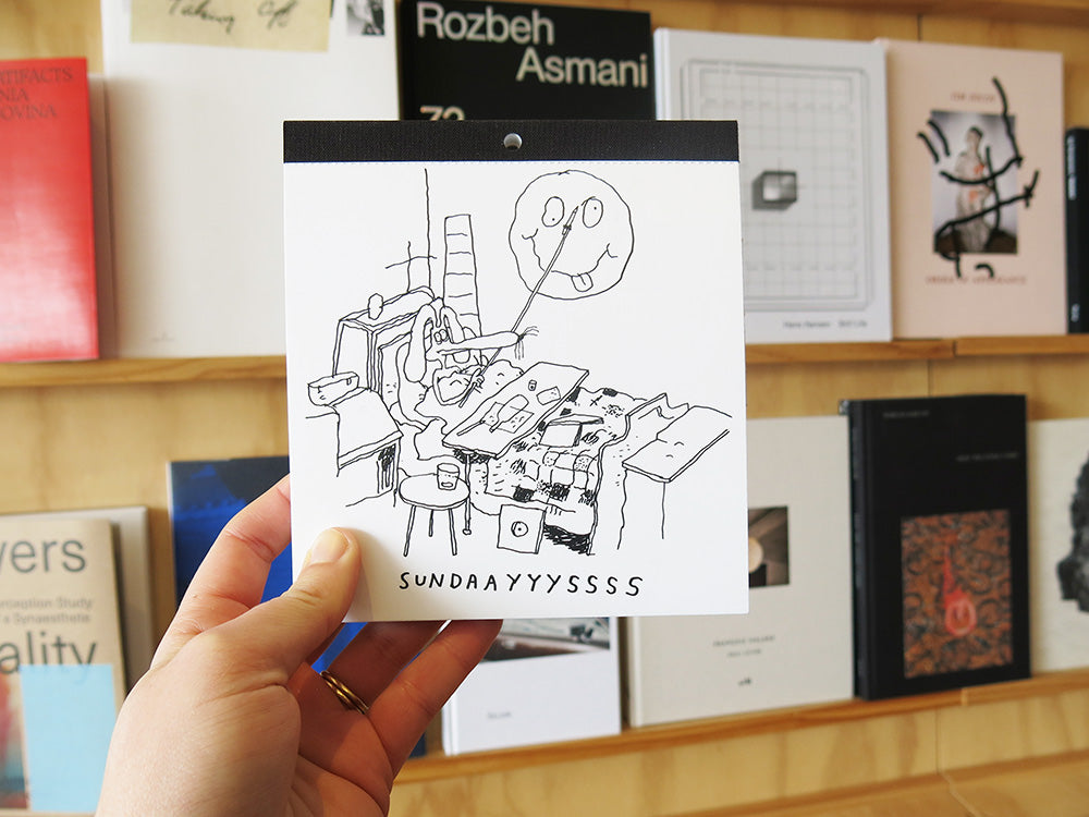 The Sundaayyyssss drawings started as an Instagram column against Stefan Marx's aversion for the seventh day of the week. These drawings are about Sunday feelings and the immense significance of this day in modern society. This tear-off calendar has 52 pages and can be started any Sunday in the year, every year. Marx is a Hamburg based artist. His T-shirt label The Lousy Livincompany is a platform for his drawings published on T-shirts. He has worked for numerous skateboard and T-shirt labels worldwide. His artist books are published by Nieves, Rollo-Press, and Christoph Keller Editions/JRP Ringier; as well as self-published.