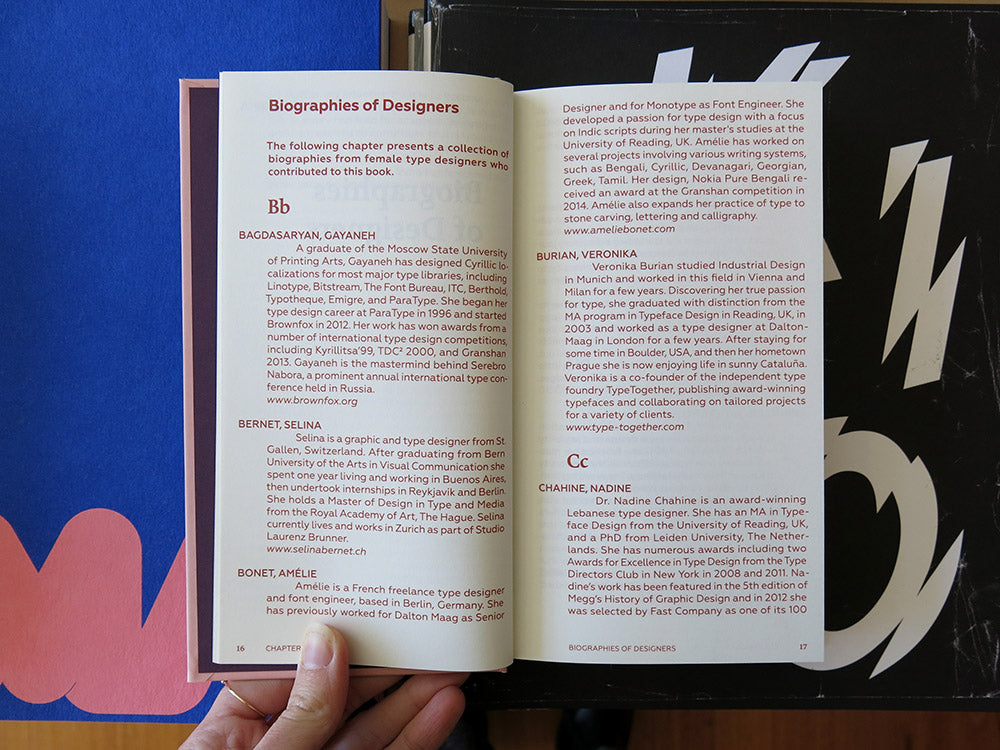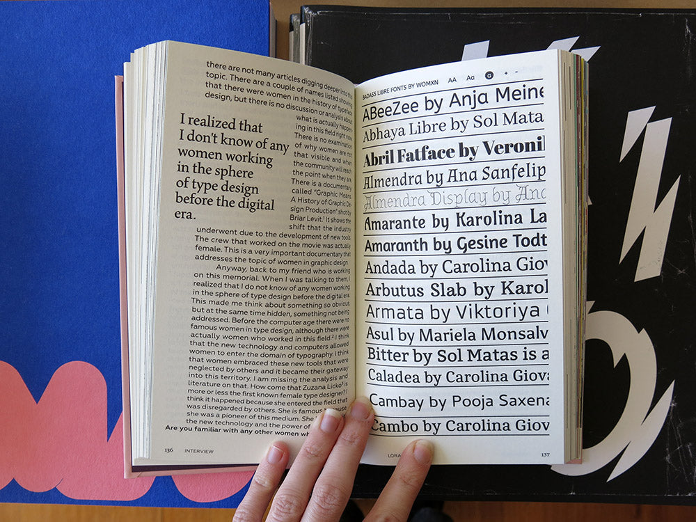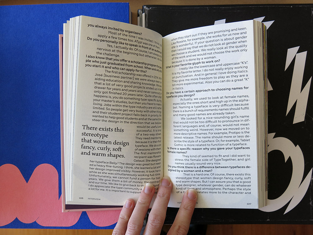 The second part is a series of the interviews with 14 women that are either currently working as type designers or are in any other way involved in the field of type design. These interviews intend to uncover the topic of unequal share of female and male speakers at type conference as well as the lack of women in the industry. The last part of the book is a showcase of typefaces designed by women. The purpose of this part is to show the great amount and broad variety of such typefaces.