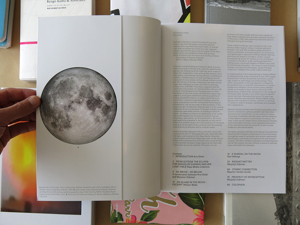 Radiant Matter comprises a series of recent artworks that are united in their desire to analyse and reflect on the nature of scientific inquiry, the role of speculation, fiction and spiritualism. Together with a poetic image essay and a conversation between the artist and the editor Kris Dittel, this widely illustrated book includes texts by Ken Hollings, Maarten Vanden Eynde and Raqs Media Collective. Published by Onomatopee (Eindhoven).