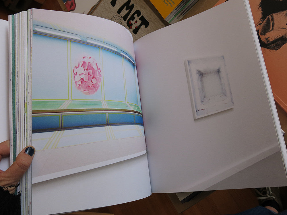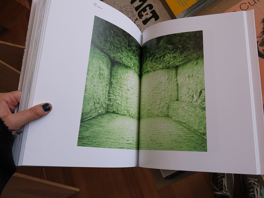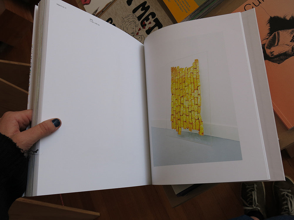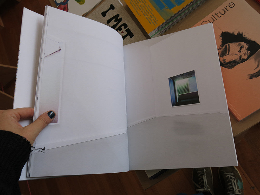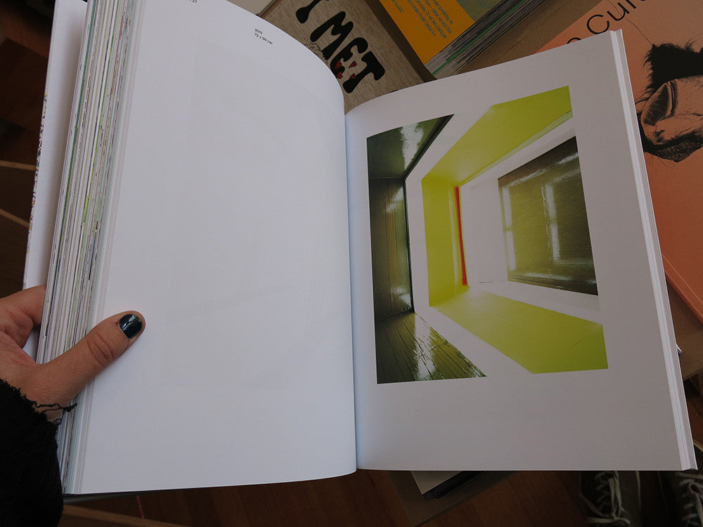 Artist Marleen Sleeuwits, known for her photography, objects and installations, takes this experimental book to propose a four-tiered representation of space: starting with two-dimensional images of space, that are then placed in a scale model, to the photos taken inside this model and, finally, to their convergence in this book. The spaces could be anything from a museum to a lobby or a passageway: locations we know as places for contemplation, for waiting or for movement. The condition of the spaces’ bare walls is hard and sober, offering little support: the space you see in front of you and the space outside your field of view, foreground and background, seem to be absorbed in a timeless vacuum. Surely there is space beyond our sight, in the realm of our imagination, containing much of our desire. How we would love to reach out for tangible attachments to activate the bare, cold or sober life: a supportive foundation not to be found in the spaces this book contains.