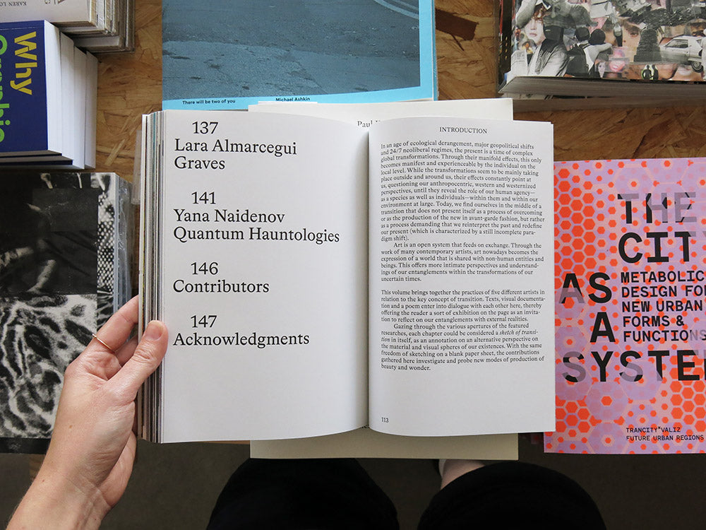 This volume brings together the practices of five different artists in relation to the key concept of transition. Texts, visual documentation and a poem enter into dialogue with each other, offering the reader a sort of exhibition on the page. An invitation to reflect on our entanglements with external realities.