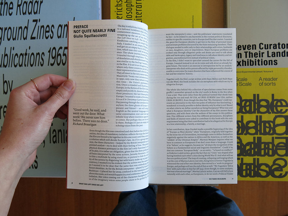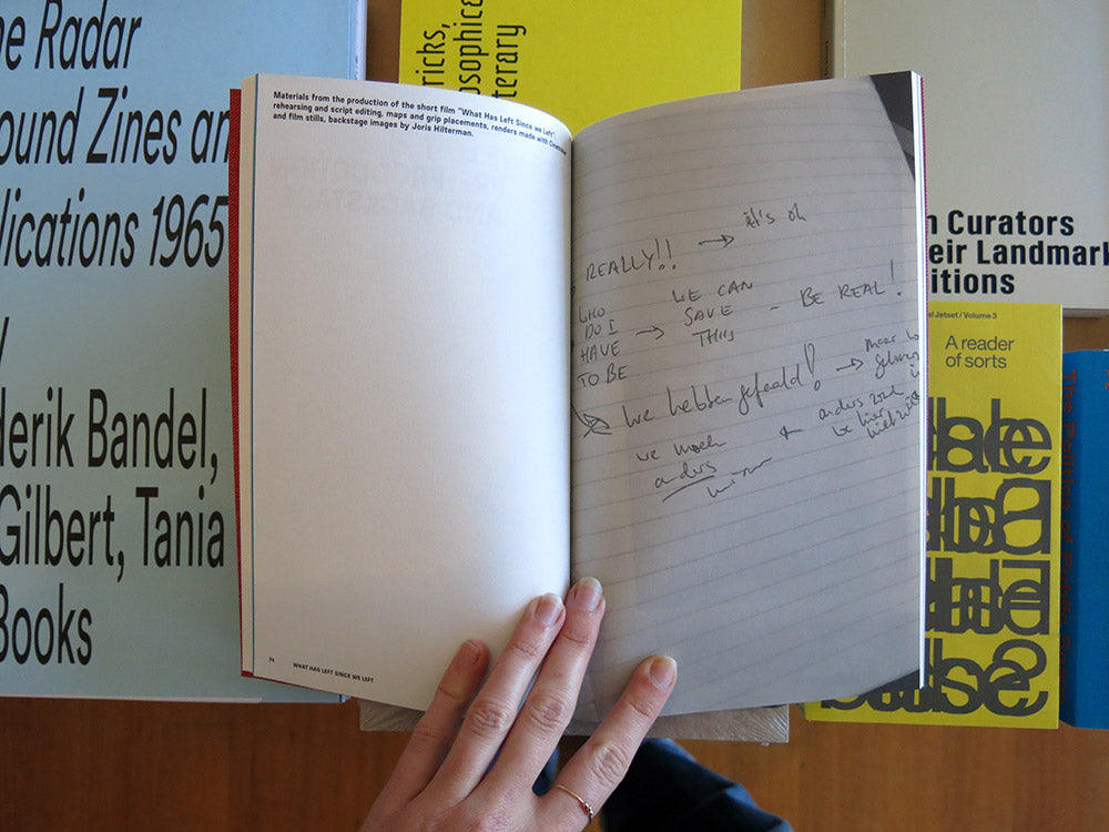 The book features contributions by Ayşe ZarakolMarwan MoujaesFederico LodoliMarina Lalovic and Erica Petrillo. Together, these texts complement and expand on the script for the film What has left since we left – directed by Giulio Squillacciotti and written with Daan Milius and Huib Haye van der Werf – which fictionalises the current European dystopia by re-enacting and problematising the rituals of kinship and relational struggles. Backstage images and film stills from this production, along with a European timeline from World War II up until Brexit compiled by Enrico De Gasperis, provide a specific overview to the entire project.