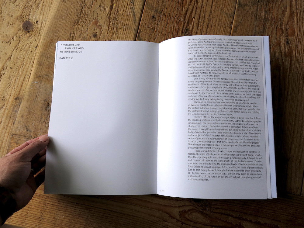 In the images that populate his debut book Surface Phenomena – which is designed by Narelle Brewer and published by Perimeter Editions (Melbourne) – the horizon, the land or any other contextual details are absent; the ocean is everything and everywhere. The mass of turbulence and white water and the deft flashes of calm that these photographs describe occupy a fundamentally different formal and conceptual space to the iconography of the Australian coast. His mode of practice might just as proficiently be read through the late Modernist prism of seriality. Without the luxury of context – without foreground and horizon – Celestino’s images become loaded with formal, allegorical and interpretive potential. We can only begin to approach an understanding of the nature of our chosen subject through a process of assiduous repetition.