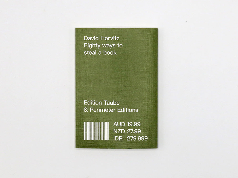 86 pages, 10.5 x 15.5cm, perfect bind softcover, Edition Taube (Munich / Zurich) x Perimeter Editions (Melbourne).