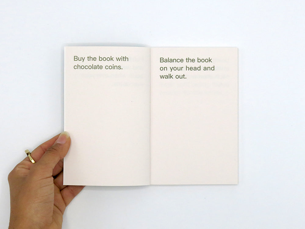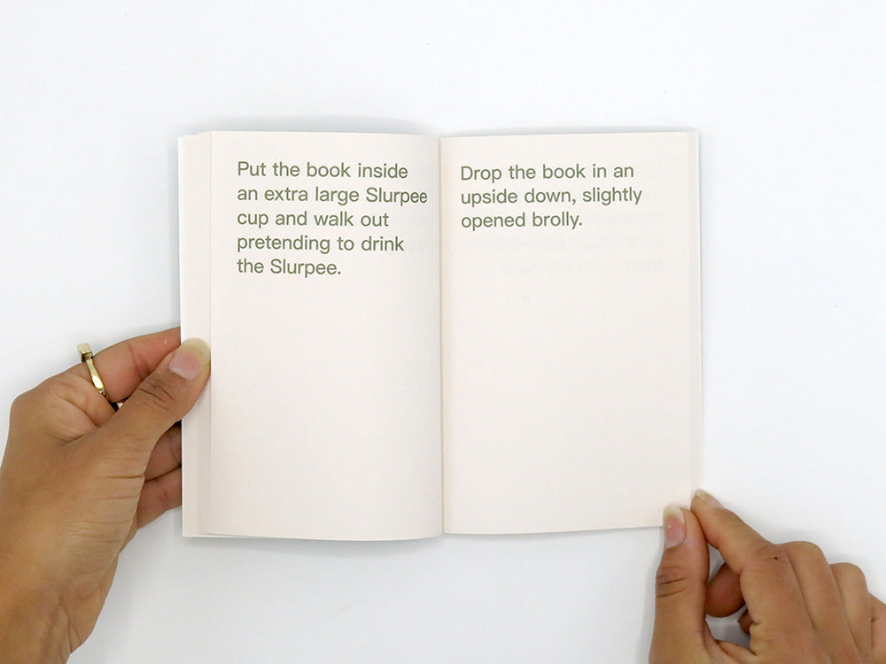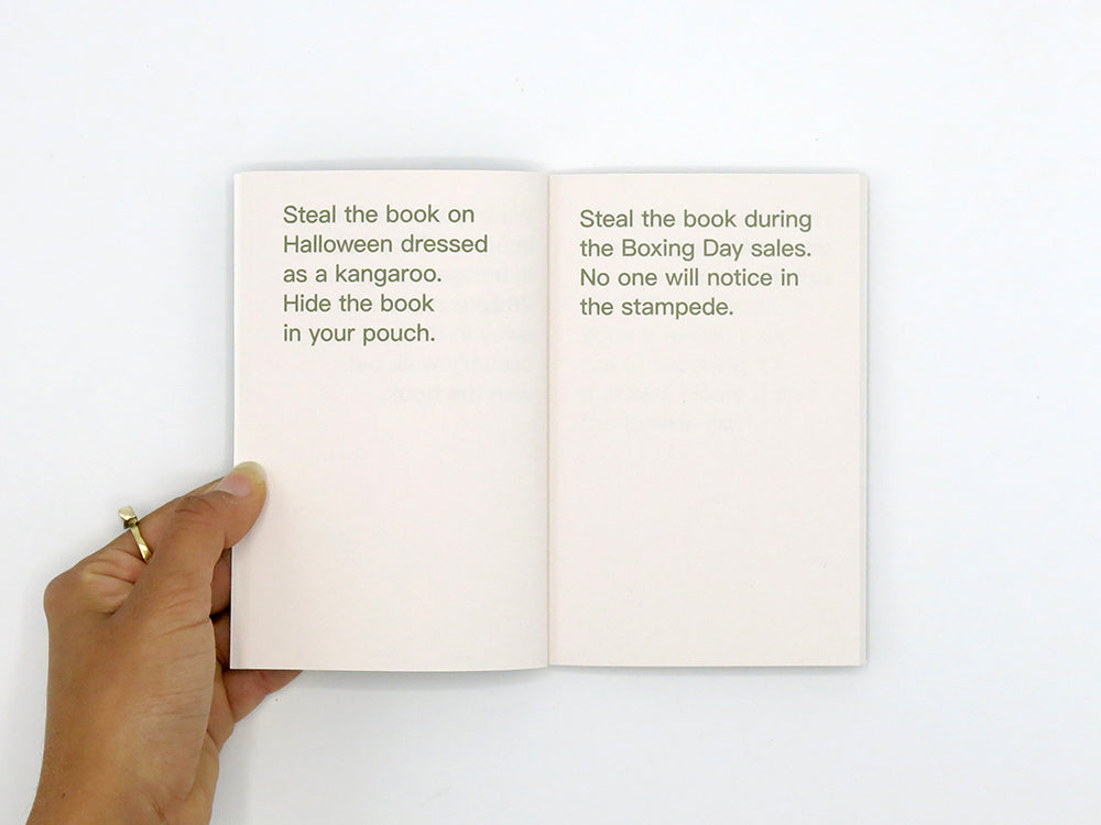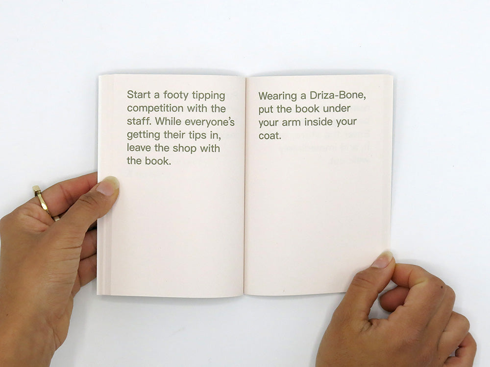 The artists’ book How to shoplift books by David Horvitz is a guide on how to steal books. It details 80 ways in which one can steal a book, from the very practical, to the witty, imaginative and romantic. Originally published in 2013, this paperback reissue is making the sought after title available again at an affordable price (for those who don’t yet know the techniques described within) and is released in multiple languages.