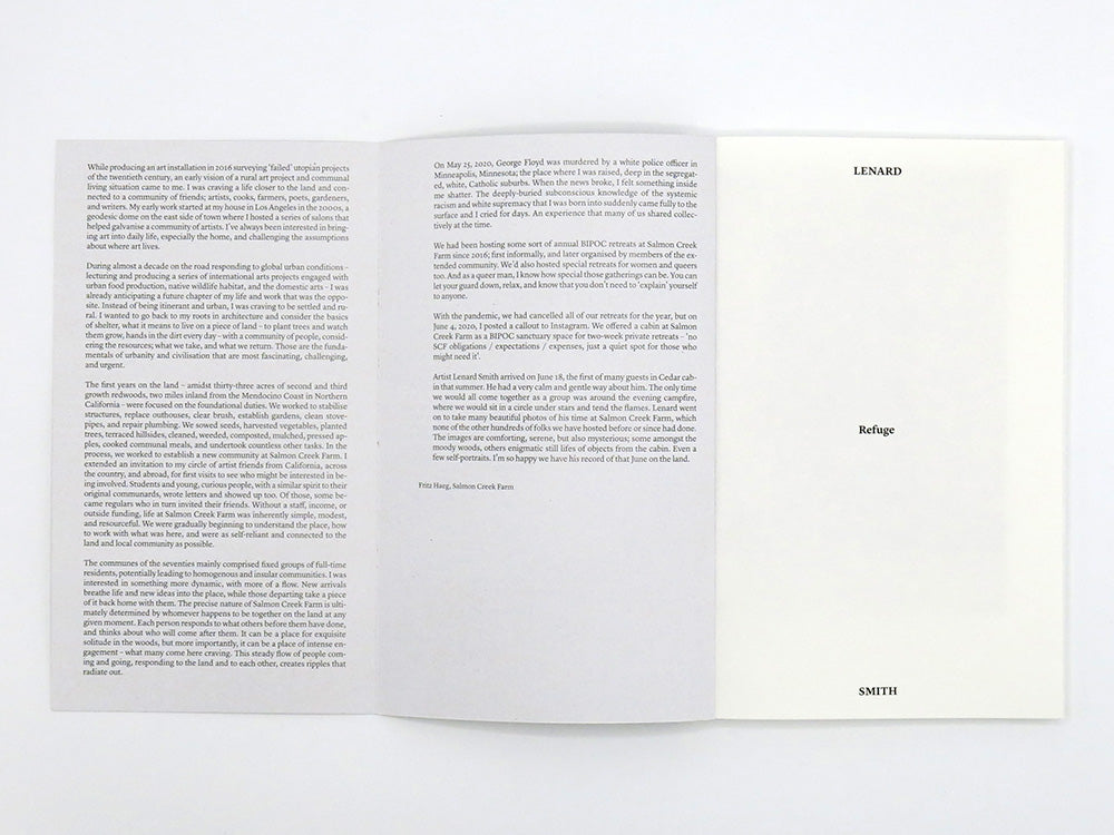But even with such bearings and signposts, Smith’s images prove open, dialogic, and free – they are unlikely conversationalists. In a prescriptive sense, this book is about neither Salmon Creek Farm nor the socio-cultural context, but it is little without them. Refuge is about an artist being given the space to live freely, to think, and make, and play. It is about safety, and the richness of introspection, solemnity, reflection, and creativity that it affords – a richness that so many of us take for granted.