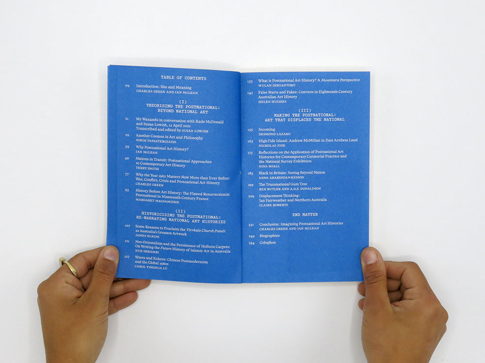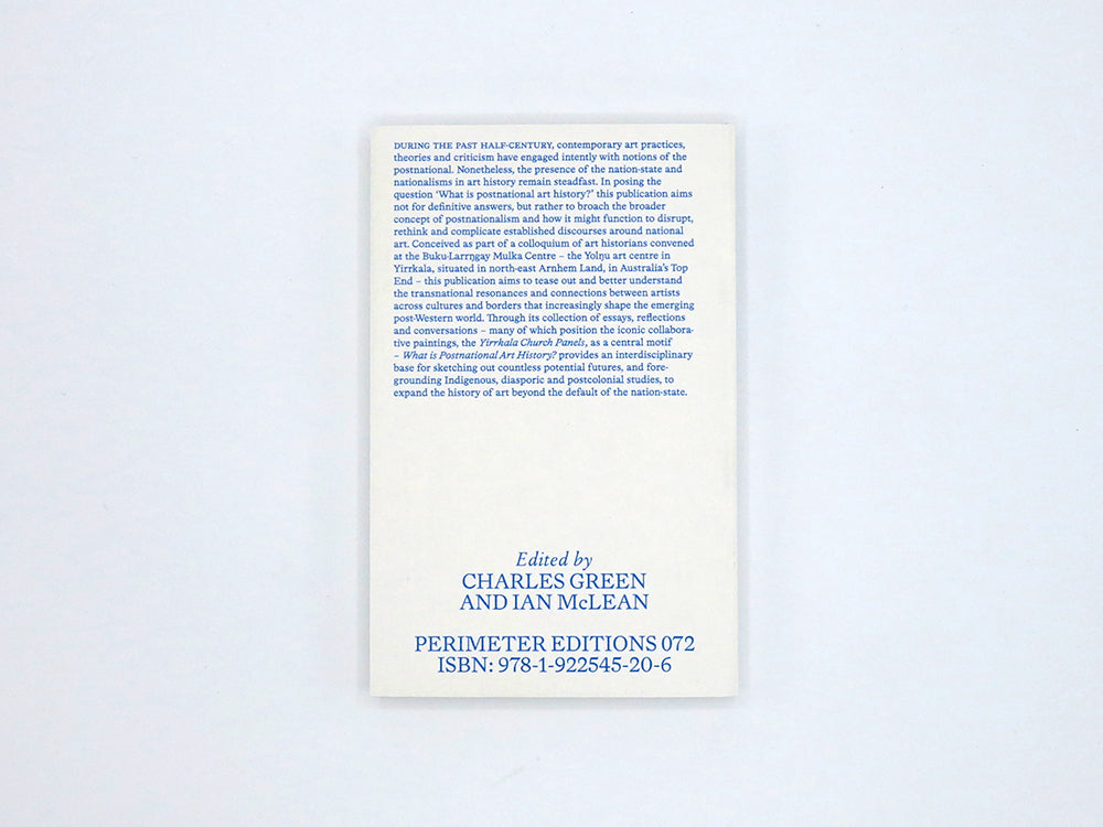 During the past half-century, contemporary art practices, theories and criticism have engaged intently with notions of the postnational. Nonetheless, the presence of the nation-state and nationalisms in art history remain steadfast. In posing the question ‘What is postnational art history?’ this publication aims not for definitive answers, but rather to broach the broader concept of postnationalism and how it might function to disrupt, rethink and complicate established discourses around national art. Edited by Charles Green and Ian McLean, designed by Beaziyt Worcou, and conceived as part of a colloquium of art historians convened at the Buku-Larrngay Mulka Centre – the Yolgnu art centre in Yirrkala, situated in north-east Arnhem Land, in Australia’s Top End – this book aims to tease out and better understand the transnational resonances and connections between artists across cultures and borders that increasingly shape the emerging post-Western world. Through its collection of essays, reflections and conversations – many of which position the iconic collaborative paintings, the Yirrkala Church Panels, as a central motif – What is Postnational Art History? provides an interdisciplinary base for sketching out countless potential futures, and foregrounding Indigenous, diasporic and postcolonial studies, to expand the history of art beyond the default of the nation-state.
