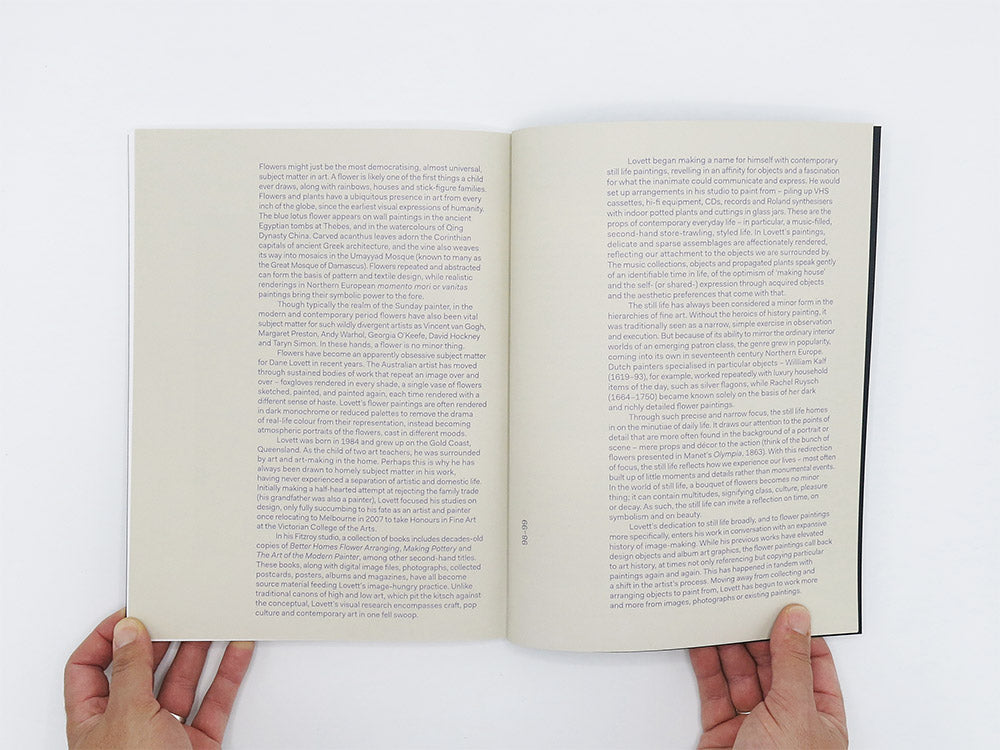 Dane Lovett’s flower paintings both embrace and eschew their historical, thematic and allegorical roots. Dark, often monochromatic and subtly tonal in their palette, the scores of works that populate the Melbourne-based artist’s debut book Flowers gesture towards the syntaxes of minimalism and seriality as resolutely as they do the still life. It’s an intriguing dynamic, which expands and further articulates Lovett’s culturally savvy, reference-rich painting practice.