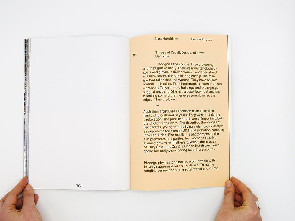 Photography has long been uncomfortable with its very nature as a recording device. The same tangible connection to the subject that affords the photographic medium and process its singular charge – its requisite proximity and contact with its referent, and the direct inscription of light on celluloid or sensor – also presents its great anxiety. In a career stretching back to the 1990s, Melbourne artist Eliza Hutchison has worked to slice, shred, fold, mirror and sculpt photographic images, materials and surfaces to both activate and complicate the photograph’s chain of command. The images that echo throughout her long-awaited debut book Family Photos – many of which came out of a residency at the Cité des Arts in Paris – both embrace and shatter their collective title. Prised from the swamp of Hutchison and her family’s wider history, present and semiconscious, they ricochet between intense intimacy and collective significance, applying photography’s indexical potential to the most ephemeral and malleable of moments. Here, she makes visible the turbulence of the psychological and the uncertainty and fallibility of memory.