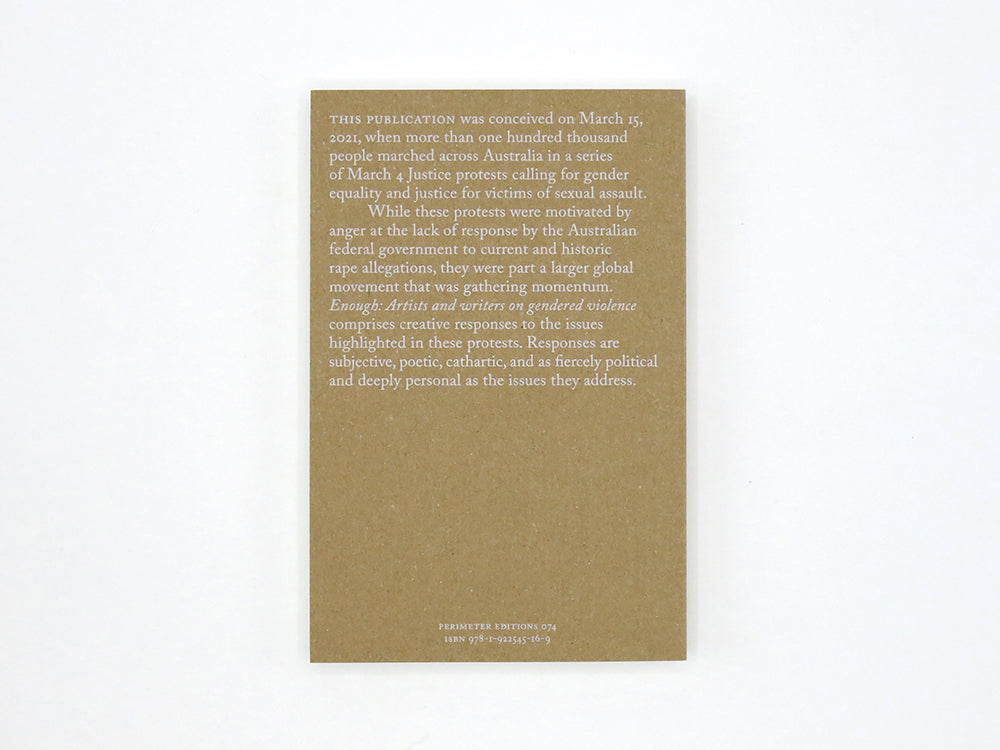 This publication was conceived on March 15, 2021, when more than one hundred thousand people marched across Australia in a series of March 4 Justice protests calling for gender equality and justice for victims of sexual assault. While these protests were motivated by anger at the lack of response by the Australian federal government to current and historic rape allegations, they were part a larger global movement that was gathering momentum. Edited by Vikki McInnes and designed by Kim Mumm Hansen, Enough: Artists and writers on gendered violence comprises creative responses to the issues highlighted in these protests. Responses are subjective, poetic, cathartic, and as fiercely political and deeply personal as the issues they address.