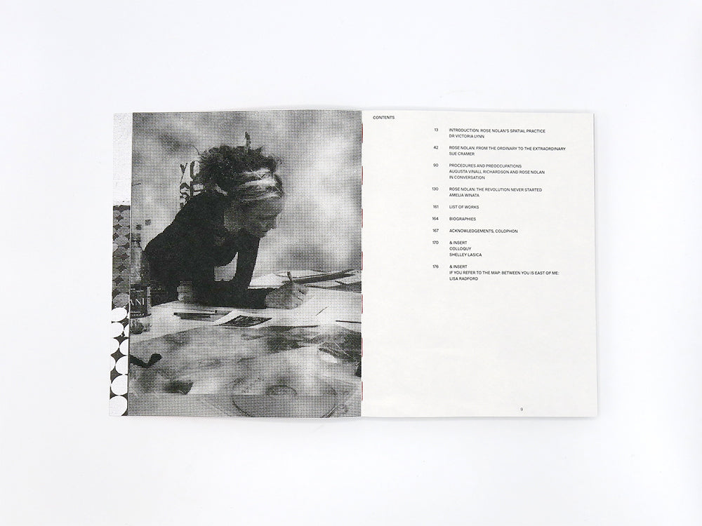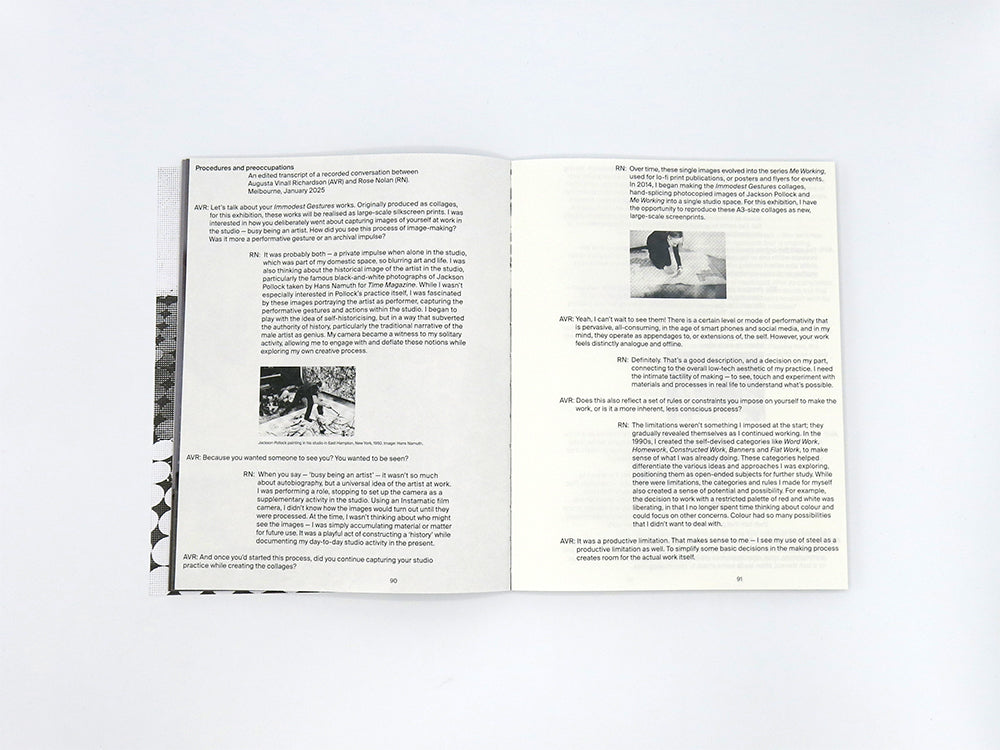 Co-published by Perimeter Editions and TarraWarra Museum of Art, Breathing Helps features new texts by Dr Victoria Lynn, Sue Cramer, Amelia Winata, and Lisa Radford, and a conversation between Rose Nolan and Augusta Vinall Richardson. The publication also includes images from Nolan’s ongoing Me Working series, which features everyday process documentation from the studio, and a performance map from artist and choreographer Shelley Lasica, who – in an interdisciplinary gesture – was invited by Nolan to present a series of choreographic performances, titled COLLOQUY, that navigate the spaces and ideas of the exhibition.