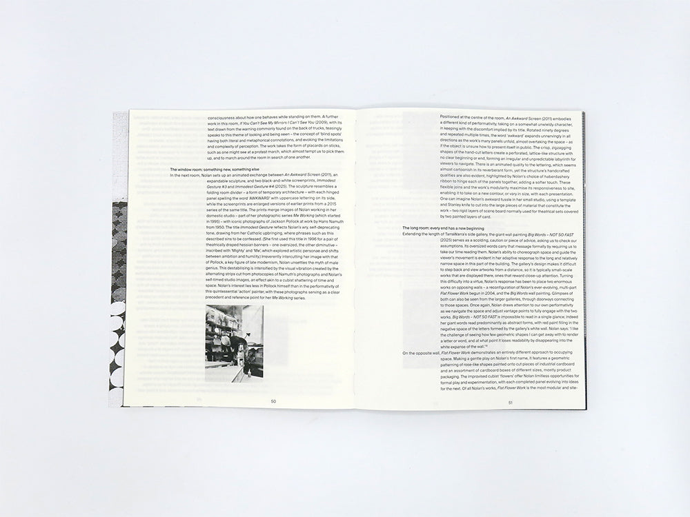 Published alongside the major solo exhibition of the same name at TarraWarra Museum of Art, the major new book Breathing Helps highlights the recurring spatial and performative threads that play out across Nolan’s practice, alongside documentation of new site-specific commissions that respond to the museum’s architecture. Spanning installations, screenprints, photography, and text-based works, Breathing Helps offers a fresh encounter with Nolan’s radically reduced red-and-white aesthetic, and her enduring interest in material, process, and repetition. Constructed from utilitarian materials such as hessian and cardboard, her bold forms are often shaped by physical labour and seriality. Within the publication – as within the exhibition – viewers are encouraged to move in and around Nolan’s forms, encountering the work via multiple spatial perspectives, and revealing embedded texts through motion and participation.