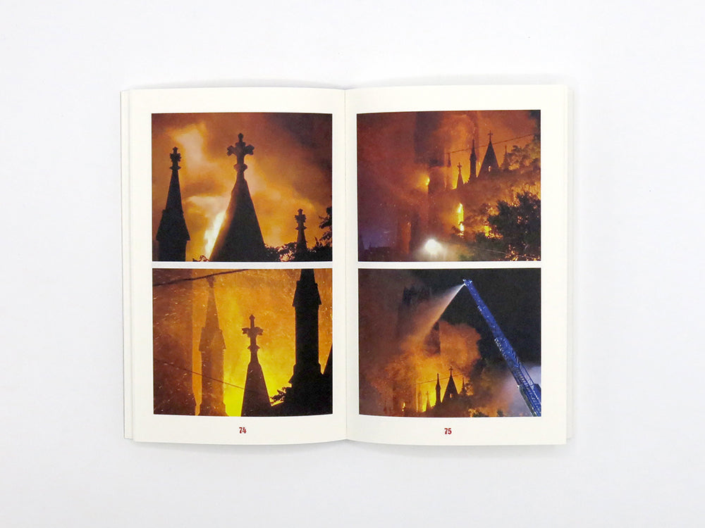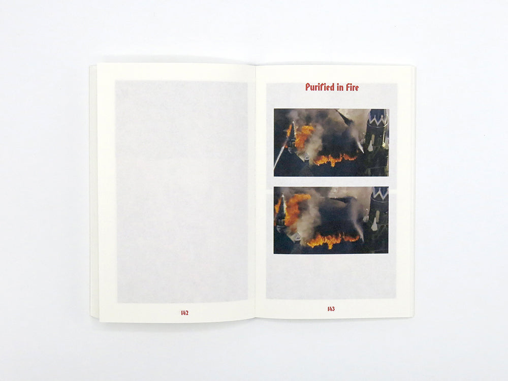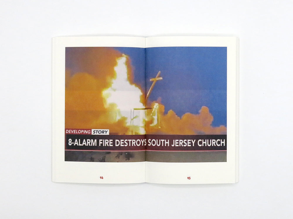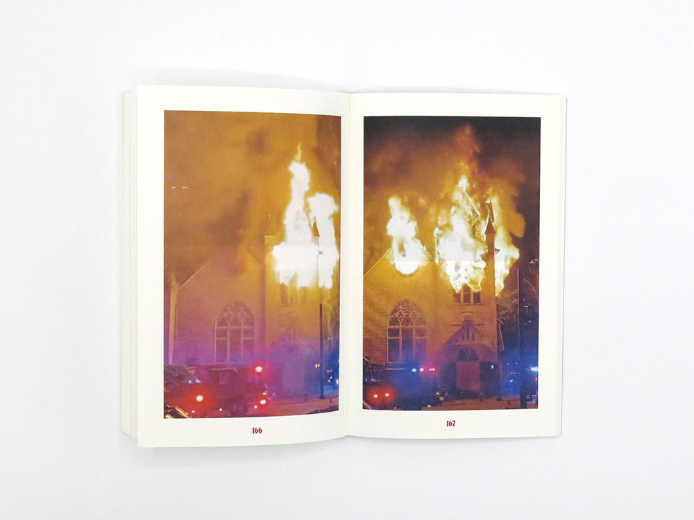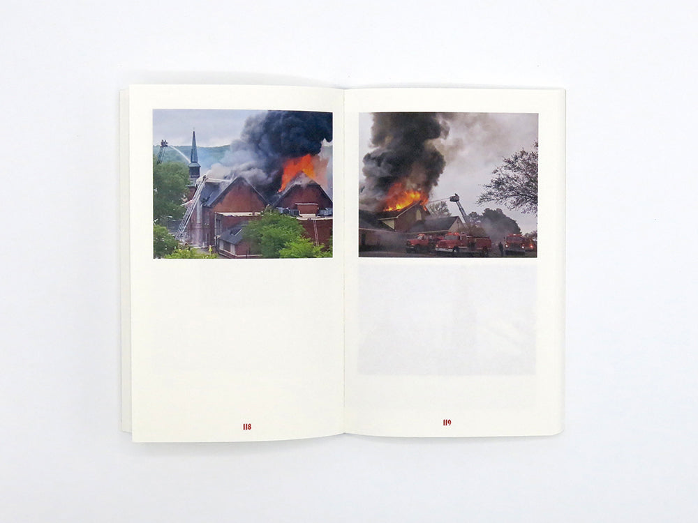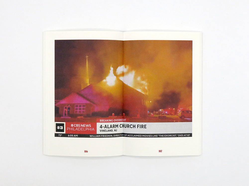 Tim Coghlan’s Hell’s Gates II: Retribution is the second complete volume of the Hell’s Gates series, following the 2018 original (co-published by Knowledge Editions and Perimeter Editions in an edition of 666 copies), and its supplement editions Hell’s Gates: Notre Damned, An Act of God (Knowledge Editions/Perimeter Editions, 2019) and Hell’s Gates Redux (Knowledge Editions, 2022). Like its previous iterations, this pulp novel of images – a sequel in cinematic terms – sees the Melbourne-based designer and publisher delve into the realms of iconography, typology, and the implications and democracy of images. But where earlier editions used strategic Google Images searches to scour the internet for lo-res, amateur, and public domain photographs of burning houses of worship the world over, in Retribution, Coghlan focuses his gaze on a particular medium and place. Here, he utilises the moving image, creating a syntax of video stills and vignettes, picturing churches burning to the ground exclusively within the borders of the United States post-2018, the year the original Hell’s Gates was published.