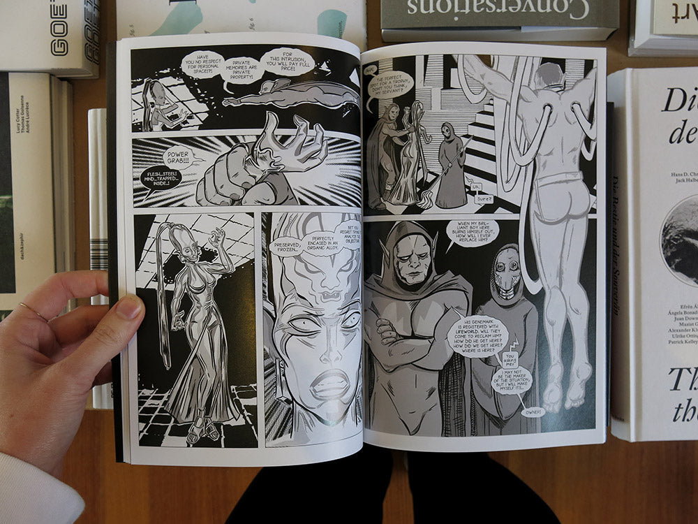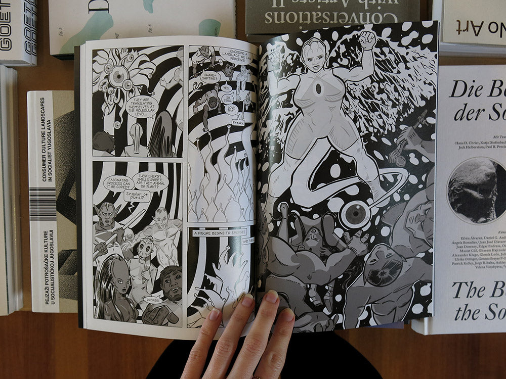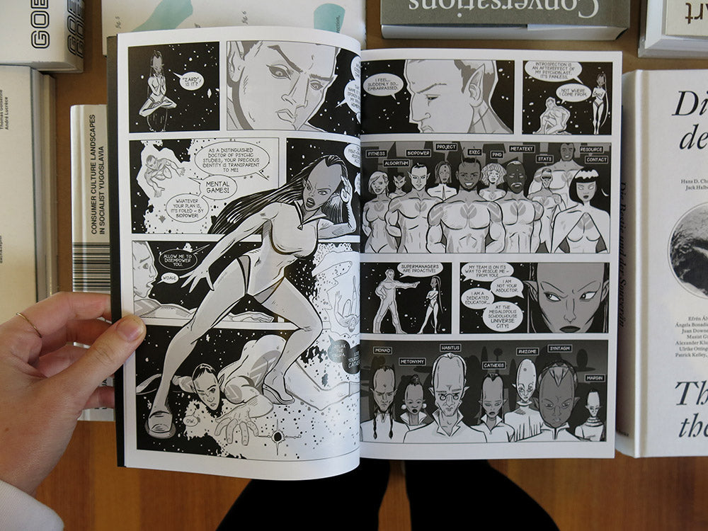 As a lifelong fan and a more recent critic of the superhero genre, artist and performer Alexandro Segade approached his first graphic novel as a solo performance, acting out all the roles: writer, penciller, inker, colourist and letterer. The Context considers the form of the graphic novel through conceptual, minimalist, op art, and constructivist aesthetics, while paying homage to the great cosmic comics of the 1970s and ’80s: Silver Surfer, Legion of Super Heroes, Green Lantern, Adam Warlock and X-Men (to name a few). A meditation on group dynamics, composed of foreshortened figures in flight set against an endless field of stars, The Context illustrates a vastness that extends past the boundaries of different art forms and ways of being.