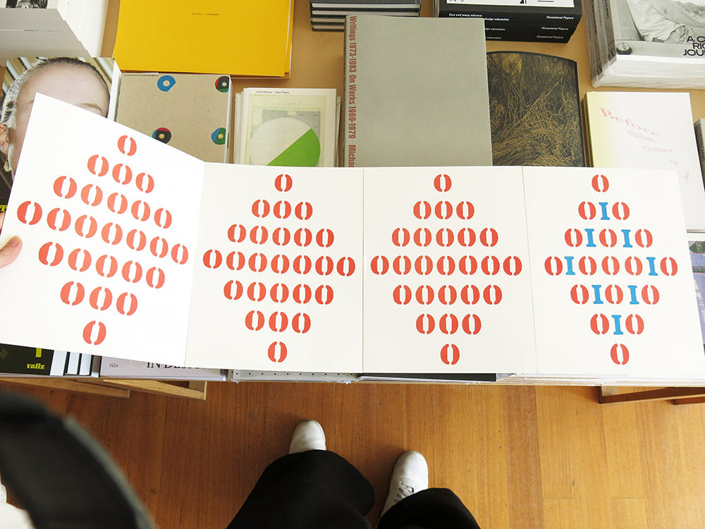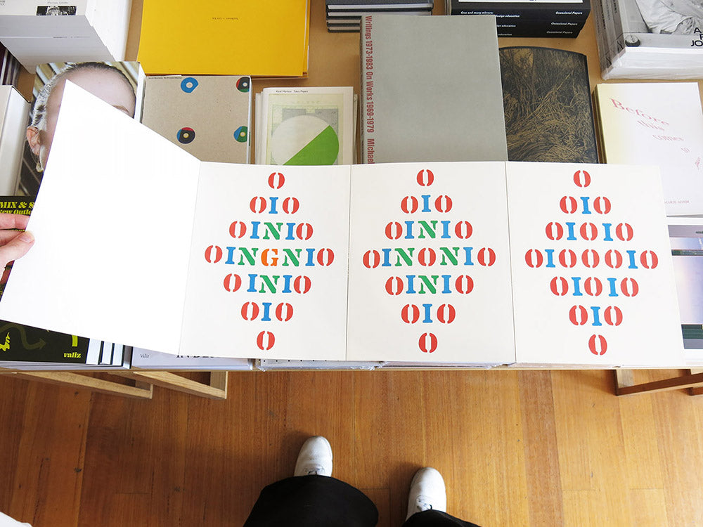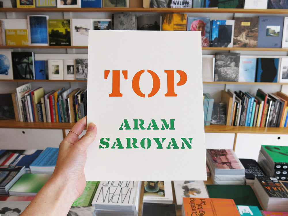 TOP is an artist book produced by Aram Saroyan in 1965. Unfolding across eight multi-colour pages, the concrete poem represents a top that spins from slow to fast to slow as the reader moves through the book. The colours and letters (comprising an obliquely glimpsed word) change in accordance with each page to notate the speed of the spinning top. Produced as an accordion fold with taped seams, TOP can be read as a book or unfolded to stand on a shelf or table.