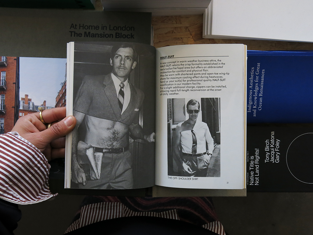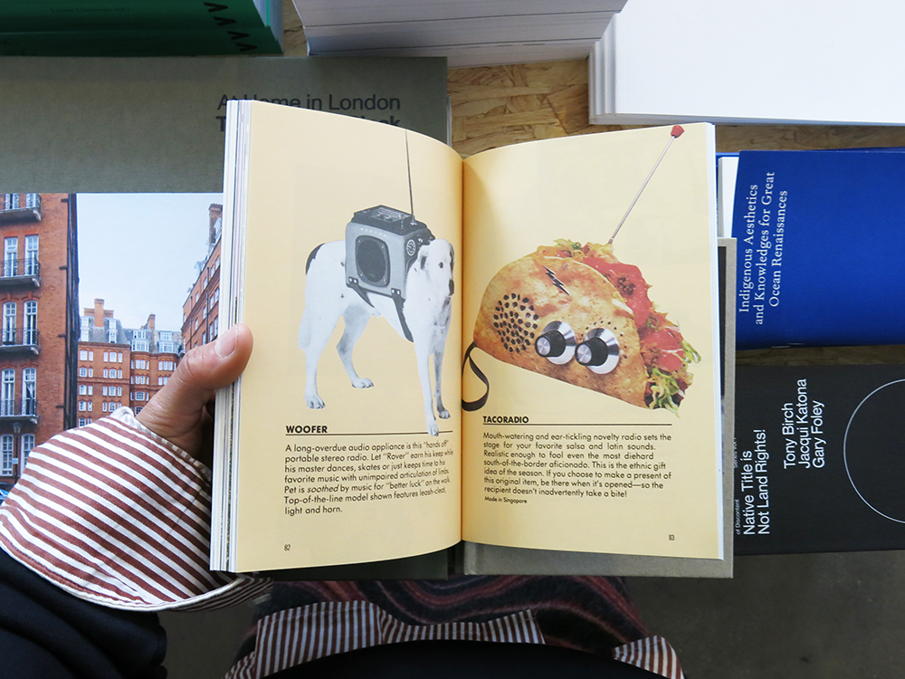 Pippa Garner’s Better Living Catalog, originally published in 1982, takes the form of a mail order catalog featuring clever and whimsical inventions that parody consumer goods while simultaneously critiquing America’s obsession with ingenuity, efficiency, leisure, and comfort. These works, which were made as prototypes and photographed for the publication, take the form of improbable accessories, clothing, footwear, home appliances, and office gadgets.