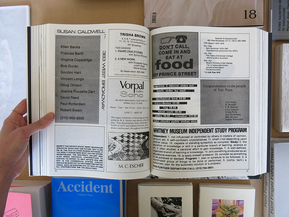 Featured artists include Vito Acconci, Kathy Acker, Bas Jan Ader, Laurie Anderson, John Baldessari, Gregory Battcock, Lynda Benglis, Mel Bochner, Marcel Broodthaers, Trisha Brown, Chris Burden, Scott Burton, Ulises Carrión, Judy Chicago, Lucinda Childs, Christo, Diego Cortez, Hanne Darboven, Agnes Denes, Ralston Farina, Richard Foreman, Peggy Gale, Gilbert & George, John Giorno, Philip Glass, Leon Golub, Peter Grass, Julia Heyward, Nancy Holt, Ray Johnson, Joan Jonas, Richard Kern, Lee Krasner, Shigeko Kubota, Les Levine, Sol LeWitt, Lucy Lippard, Babette Mangolte, Brice Marden, Agnes Martin, Gordon Matta-Clark, Rosemary Mayer, Annette Messager, Elizabeth Murray, Alice Neel, Brian O’Doherty,Genesis P-Orridge, Nam June Paik, Charlemagne Palestine, Judy Pfaff, Lil Picard, Yvonne Rainer, Judy Rifka, Dorothea Rockburne, Ed Ruscha, Robert Ryman, David Salle, Carolee Schneemann, Richard Serra, Jack Smith, Patti Smith, Robert Smithson, Holly Solomon, Naomi Spector, Nancy Spero, Pat Steir, Frank Stella, Alan Suicide (Vega), David Tremlett, Richard Tuttle, Andy Warhol, William Wegman, Lawrence Weiner, Hannah Wilke, Robert Wilson, Yuri, and Irene von Zahn.