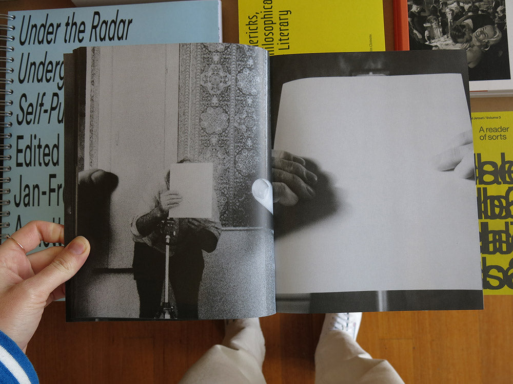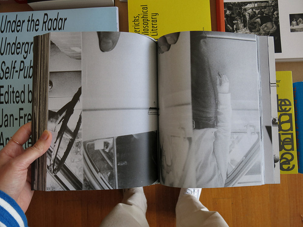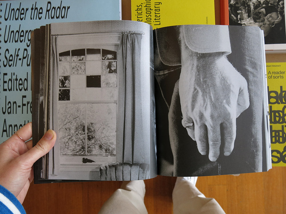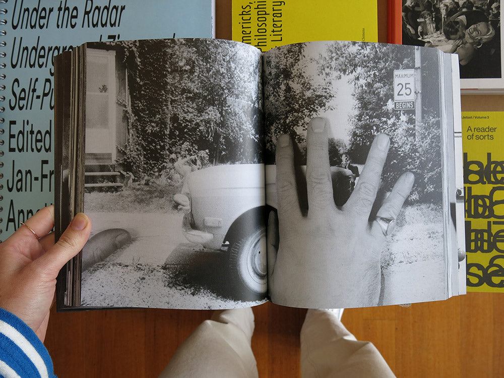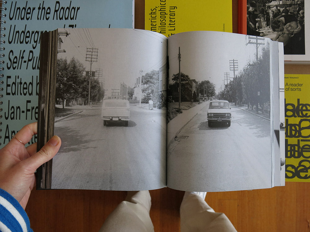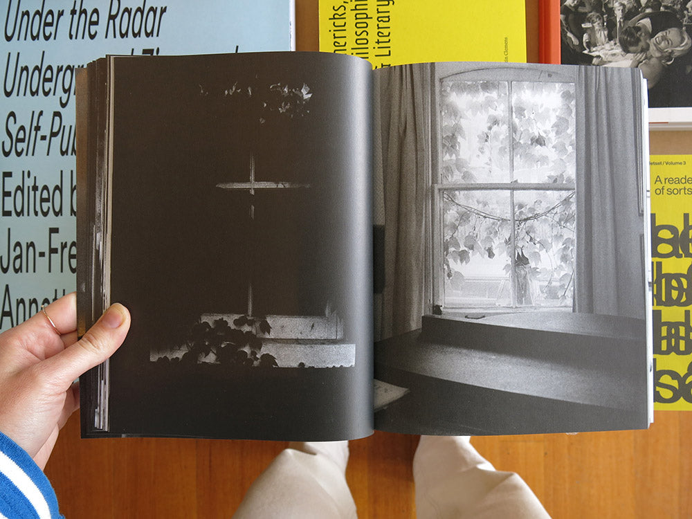 Each page features a distinct moment, seen from one perspective on the front, and from a diametrically opposed angle on the back, occasionally pivoting, for instance, between interior and exterior spaces. This organising principle is complicated by the fact that a given image might be a depiction of the physical environment surrounding the camera or, at other times, a photograph of a photograph. Midway through, the scene is inverted such that the volume must be turned upside-down to be looked at right-side up. The result is an elegant, disorienting study in simultaneity that allows the viewer to enter the work from either end.