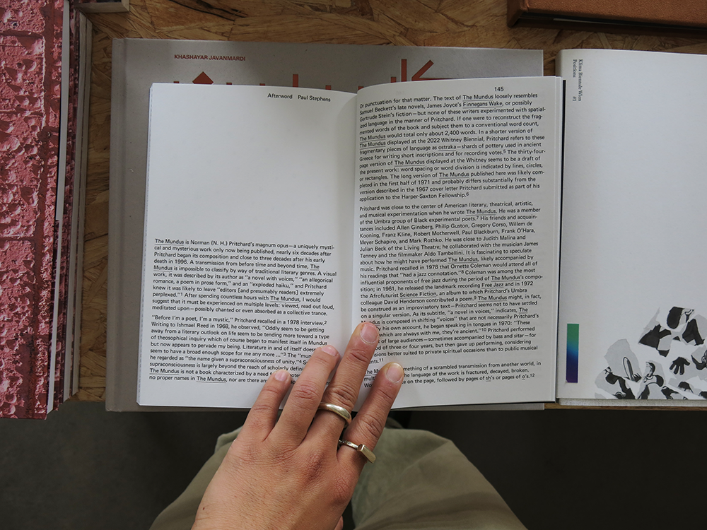 The Mundus is Norman Pritchard’s magnum opus, a mysterious work that is both visual and poetic, literary and mystical. The work was composed between 1965 until at least July 1971, a six-year period during which the author refined and reworked its pages, seeking out new literary forms alongside personal transcendence. As Pritchard mentions in a letter to Ishmael Reed in 1968, 'Literature in and of itself doesn’t seem to have a broad enough scope for me anymore'. Despite its ambitions and grand scope, The Mundus has gone unpublished for over fifty years.