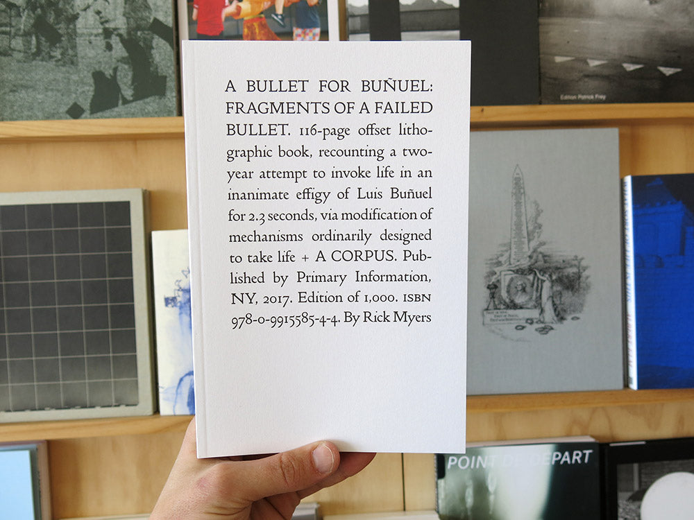 A Bullet for Buñuel: Fragments of a Failed Bullet documents Rick Myers’ attempt to complete a project begun by the late filmmaker Luis Buñuel: to create a bullet possessing such a weak charge that it would simply bounce off the filmmaker’s shirt when fired at him. Consulting with the estate and sources ranging from online forums for bullet makers to a ballistics lab associated with the United States Secret Service, Myers sought to make the bullet and fire it at a shirt that had been worn by Buñuel. While trying to bring this absurdist endeavour to completion, the artist was met with a colourful cast of characters and failures at almost every turn. A Bullet for Buñuel has taken many forms—a video work, a multiple, and a performative lecture—all of which are represented in this publication. Myers’ writing, research, correspondence, and photographs are also included in the book, which synthesises years of work into a singular meditation on the poetics of failure.