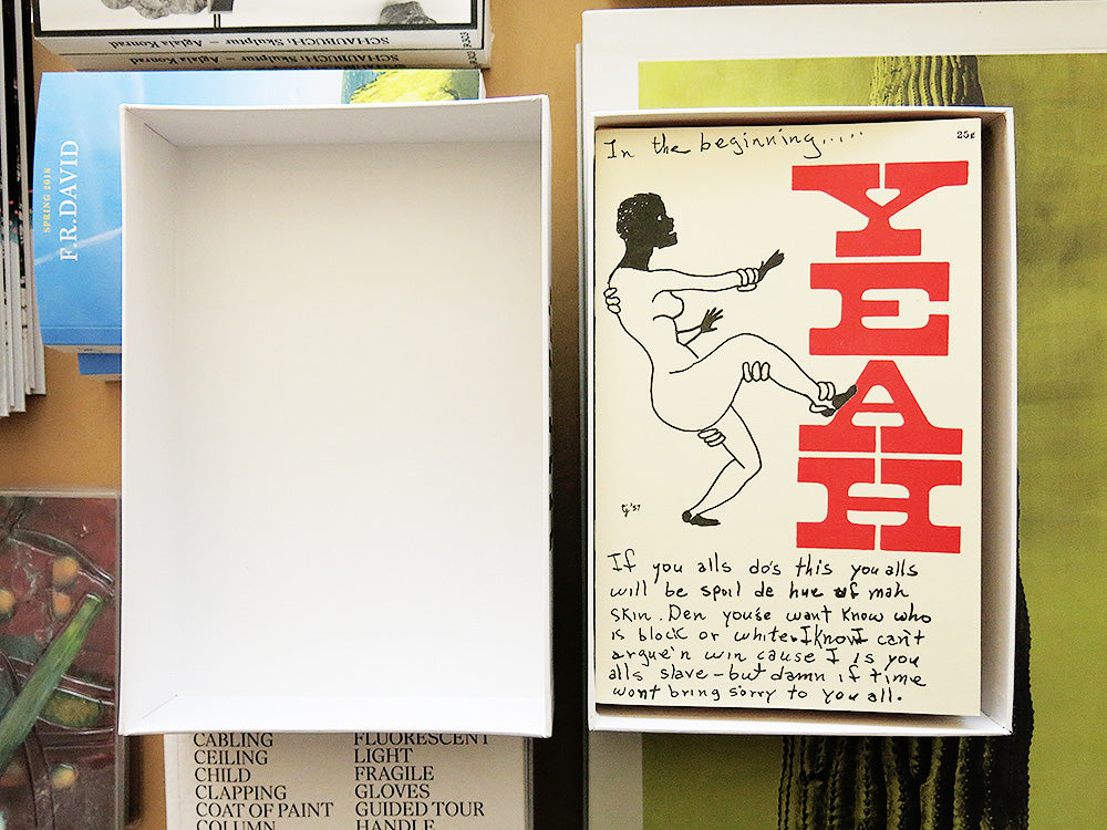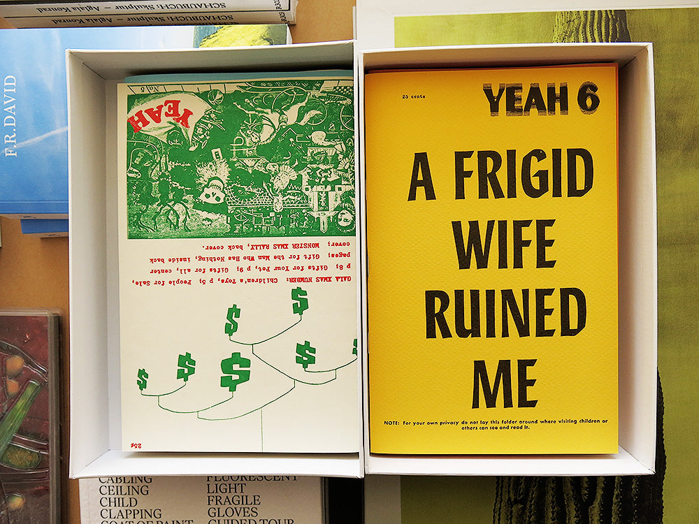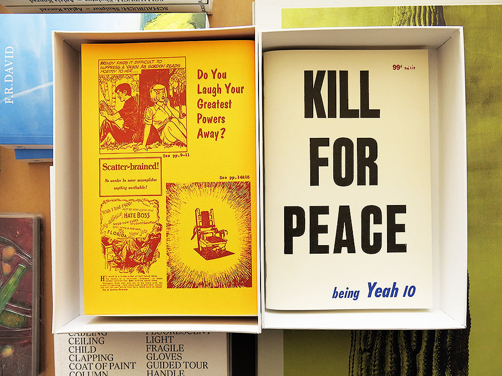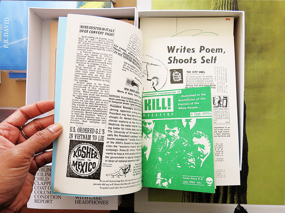 Originally published between 1961 and 1965 by Tuli Kupferberg and Sylvia Topp’s Birth Press, this volume reproduces all ten issues of YEAH magazine as individual facsimile editions, housed in a single box. Kupferberg described the magazine as “a satyric excursion; a sardonic review; a sarcastic epitome; a chronical of the last days,” and throughout its pages he acts as both editor and artist, threading the needle of leftist politics with the sarcasm and sharp creative wit for which he became known as one of the founders of the countercultural rock band The Fugs. YEAH magazine began under the shadow of the Cold War, with Kupferberg and fellow poets contributing poetry, drawings, and collages that protested a number of social issues of the time, including nuclear war, racism, white supremacy, and the conservative, middle-class values that have become the hallmark of 1950s America. By issue 8, Kupferberg dispensed with contributors, choosing instead to feature only his own work. These later issues resemble magazine-length collages, consisting of images, illustrations, and articles appropriated from magazines and newspapers compiled in an aesthetic akin to the punk, cut-and-past zine that later took shape in the ‘70s and ‘80s.