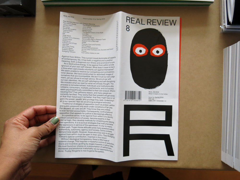 In issue 8 of Real ReviewChelsea Manning is interviewed about identity and autonomy, Virgil Abloh and Jack Self talk about how to dissolve power structures; Wolfgang Tillmans presents a 16-page special insert reviewing contemporary life. Comedian Elf Lyons reviews austerity Britain (with readymades by Nicole McLaughlin), and Jacob Dreyer reviews the current state of globalisation from the border of China and North Korea (with DPRK photography by Yuyang Liu). In two poems, Svetlana Marich reviews her desire for a doctor.
