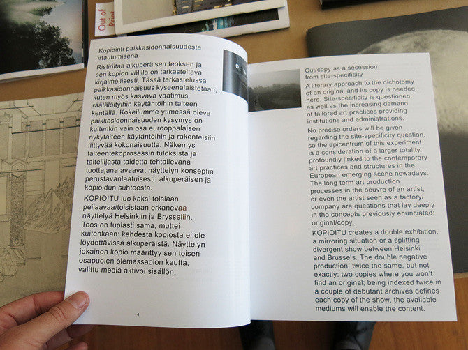 KOPIOITU proposes the notion of cut/copy as a secession from site-specificity. A literary approach to the dichotomy of an original and its copy is needed here. Site-specificity is questioned, as well as the increasing demand of tailored art practices providing institutions and administrations. No precise orders will be given regarding the site-specificity question, so the epicentrum of this experiment is a consideration of a larger totality, profoundly linked to the contemporary art practices and structures in the present emerging European scene. KOPIOITU creates a double exhibition, a mirroring situation or a splitting divergent show between the galleries Sic (Helsinki) and Komplot (Brussels). This is double negative production: twice the same, but not exactly. Participating artists include: Félicia Atkinson, Olli Keränen, Bitsy Knox, Maija Luutonen , Kalle Leino, Konsta Ojala, Jurgen Ots, Benoit Platéus, Sauli Sirviö, Timo Vaittinen and Laura Wesamaa. Curated by: Sonia Dermience, Alberto García del Castillo and Aura Seikkula. Published by Shelter Press (St Martin).