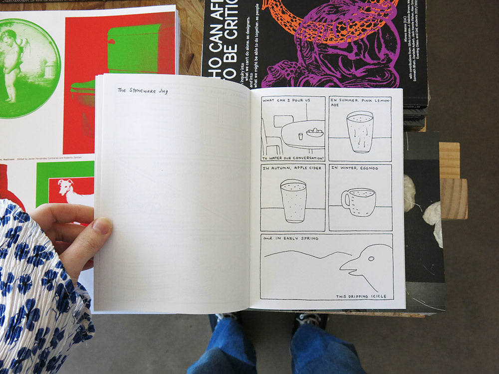 The Stoneware Jug is a collection of poem-comics by Stefan Lorenzutti (words) and John Porcellino (pictures), in which American comix legend Porcellino (King-Cat, Thoreau at Walden) 'pours' the adapted poems into his pen-and-ink panels, as if into a handmade vessel. Each one-page comic is a seasonal diorama of sorts, preserving a moment in time unfolding in the interstices of time: between the chinks of a log cabin in the Polish Highlands, fissures in late spring ice, and the gap between coziness and creeping concern on a brutally cold winter’s night. In the end, The Stoneware Jug is a quest for comfort zones, suffused throughout with the aromatic promise of panettone.