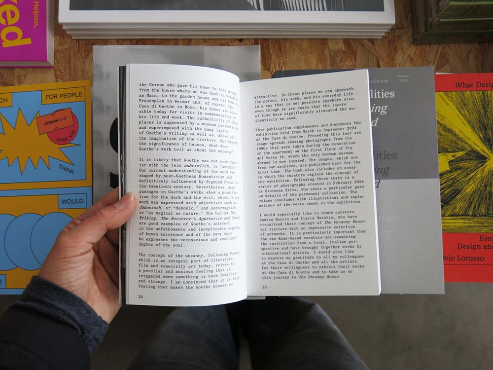 In the wake of the widespread leitmotiv that nourished literary fantasy, fairy tales, horror stories and artistic creation alike since the early 19th century, The Uncanny House investigates the sense of unheimlich within the rooms of the Rome apartment where Johann Wolfgang von Goethe lived between 1786 and 1788. It is a place that provides an especially favoured locus for uncanny disturbances: its apparent domesticity, its residue of nostalgia and its role as the last and most intimate shelter of private comfort are sharpened by the contrast of empty spaces, crevices, chimeras, ghosts, alien spirits, time shifts and voices that creep in. Through the work of eighteen international artists, the house thus becomes a place where ambiguities, obsessive thoughts and the neurotic dimensions of the human sphere become apparent.