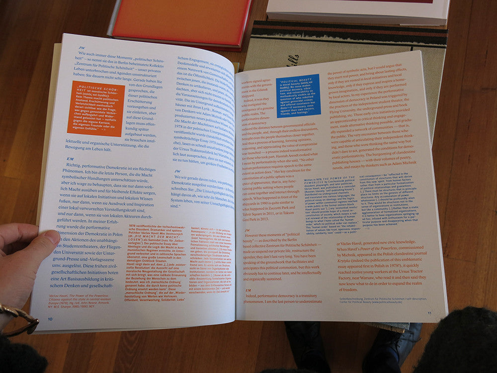 Does art have the potential to stimulate and sustain political participation? On behalf of the Galerie für Zeitgenössische Kunst, Joanna Warsza invited the artists Alexandra Pirici, Pablo Helguera, and Ulf Aminde to Leipzig to try out three projects in public and semi-public spaces: Pirici staged a choreographic intervention at the Monument to the Battle of the Nations, Helguera an improvised speaking choir, and Aminde the dress rehearsal for an art strike. All the works were shown as part of the Performative Democracy series, whose title is taken from the book of the same name by Polish sociologist Elżbieta Matynia. It describes people as politically active creatures whose collective significance is derived from their actions. The publication Art in Times of Gray Democracy brings to a close the Performative Democracy series. It is produced in magazine format.