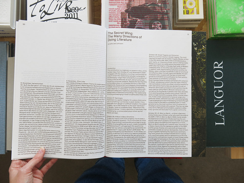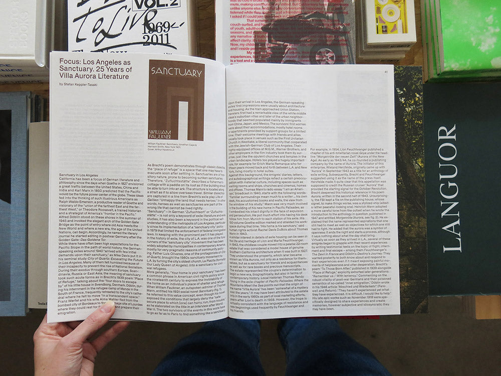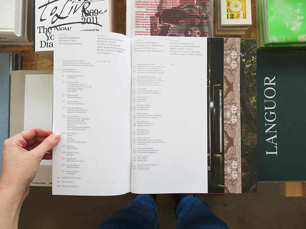 The English word 'sanctuary' means not only a holy place or sacred space of worship but also asylum and refuge. In 1943, the Villa Aurora in Los Angeles became just such a refuge for Marta and Lion Feuchtwanger, and to mark its twenty-fifth anniversary as an artist residence, the Villa is presenting reflections by writers and visual artists on sanctuaries and hermitages. In addition to new essays and poems by former fellows, the publication also includes literary essays on the literature of exile as well as exhibition views and texts from all the lonely people, curated by Nana Bahlmann.