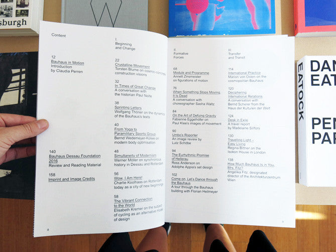 Bauhaus 8 is given over to the Bauhaus Dessau Foundation's annual theme for 2016: Movement. Its focus is on new departures in society, change and speed, migration and mobility as well as art and dynamism, architecture and performance, fancy and locomotor systems. In Bauhaus 8 we encounter Kandinsky on a bicycle, Moholy-Nagy's vision in motion, Paul Klee's overcoming gravity, Gropius's writing desk in exile, and Karla Grosch's programs of physical education at the Bauhaus as well as numerous other protagonists. The annual publication combines historical views with the contemporary positions of designers, artists, acrobats, choreographers, curators, and photographers. In the process it moves from the Bauhaus Building in Dessau to the Van Nelle Factory in Rotterdam, to the festival stage at the Festival House Hellerau, to Lawn Road Flats in London, and other venues. A collection of essays, interviews, portraits, collages, illustrations, and artistic contributions. Text: Ross Anders, Regina Bittner, Paul Nolte, Gabi Schillig, Sasha Waltz. Published by Spector Books (Leipzig).