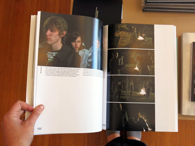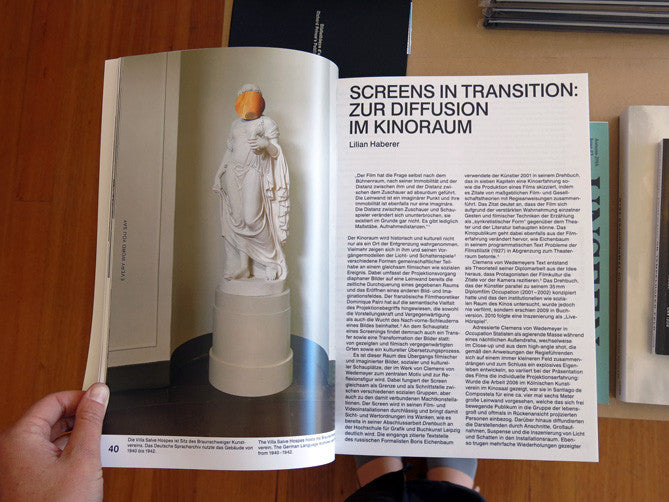 “For some time now the cinema auditorium has given me sleepless nights,” writes filmmaker Clemens von Wedemeyer. “What would it be like if the walls in a multiplex cinema were to vanish and you were free to shift your gaze so that your eyes could wander over to the next screen. Or the inside became the outside and the walls of the cinema disappeared.” In his installations, the screen becomes not only a projection surface but also a membrane, the seam between the performance and the locations where it was shot. The film’s intervention makes historical and political narratives become visible in these locations as zones of conflict, for instance, in prisons, on borders, or in the museum. Courtesy of Spector Books (Leipzig).