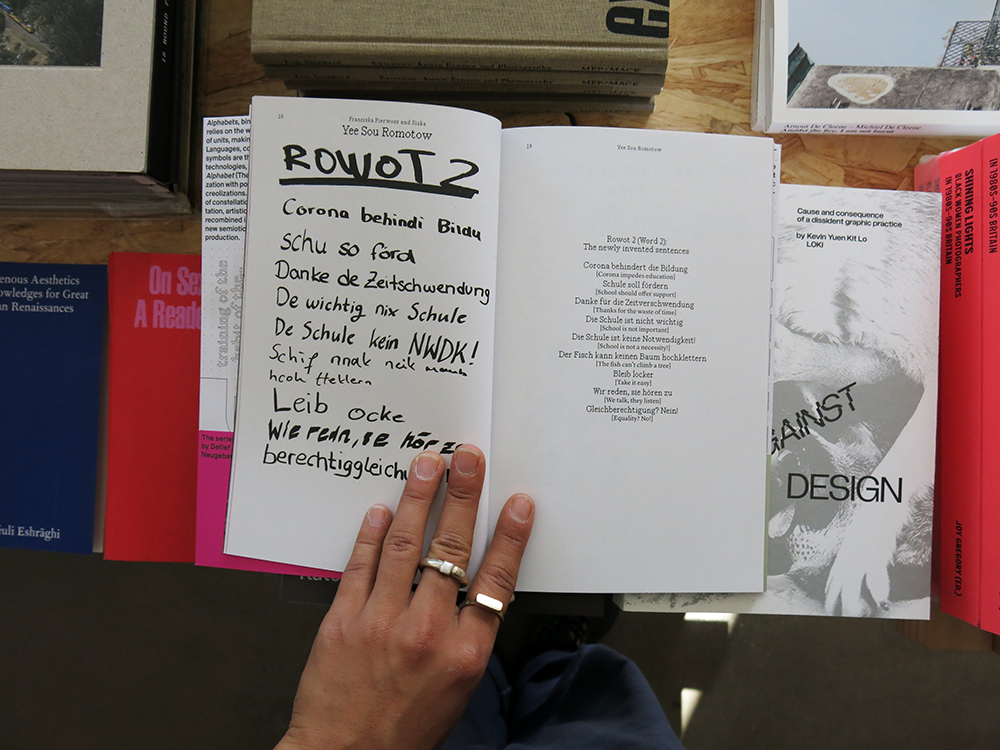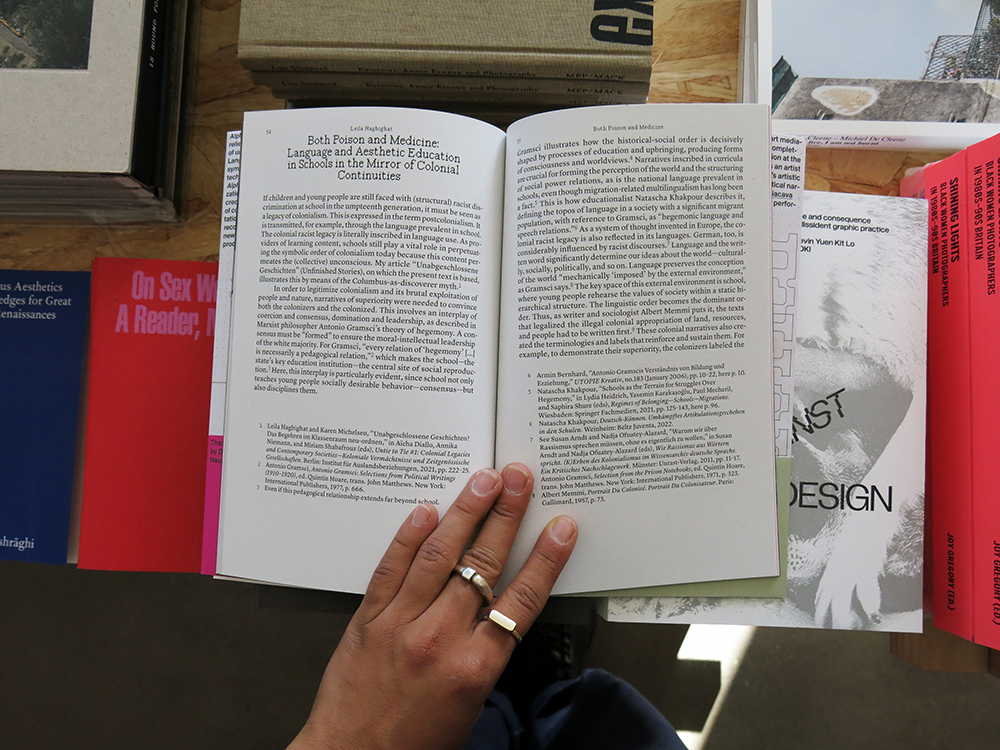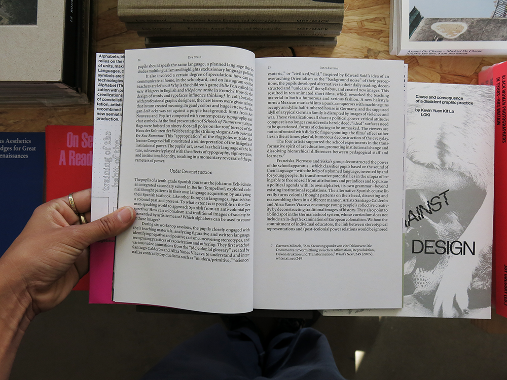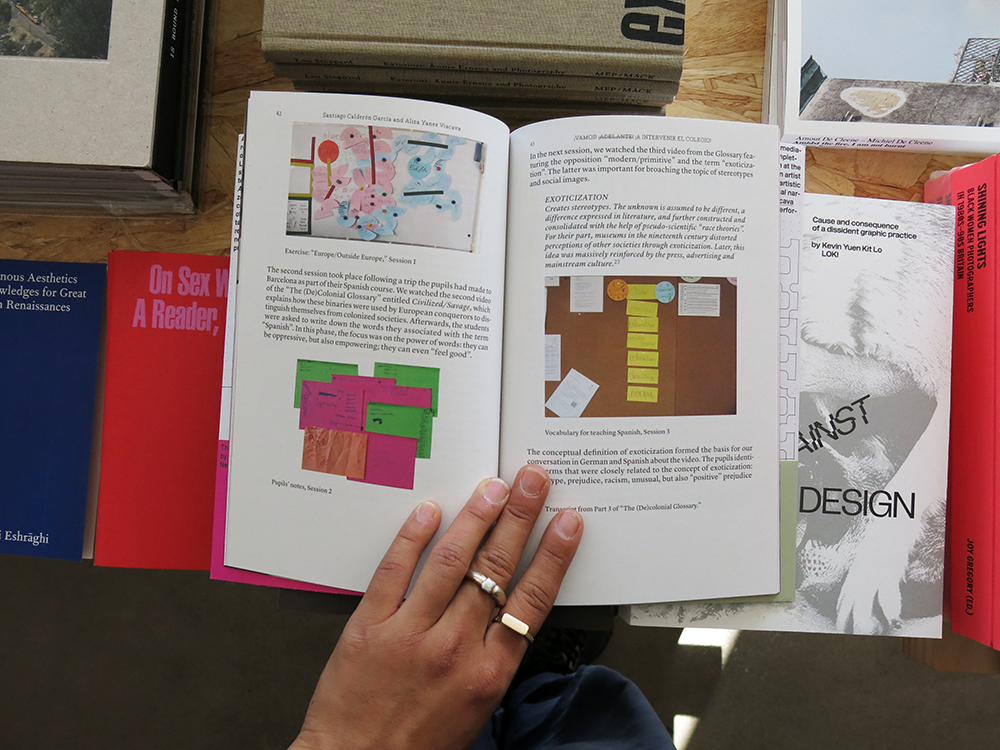 The language of tomorrow originates in the schools of today. This book looks at (colonial) alphabets in the school microcosm, centring on a Spanish course at Johanna-Eck-Schule in Berlin and the project work carried out with Santiago Calderón and Aliza Yanes. The two artists present their own animated film images as a counter to the Eurocentric narratives offered by the class textbook which are rooted in colonialism. The students’ everyday lives are also determined by the informal use of language; here we are able to look into the pages of books and get to listen in on break-time conversations. How do the exchanges between the students, which are typically multilingual, tally with the monolingual transfer of knowledge? How does online hate speech affect people’s thinking? How can a syntax of body language be found? And how can the creative potential of memes and chat shorthand be transferred to educational practice?