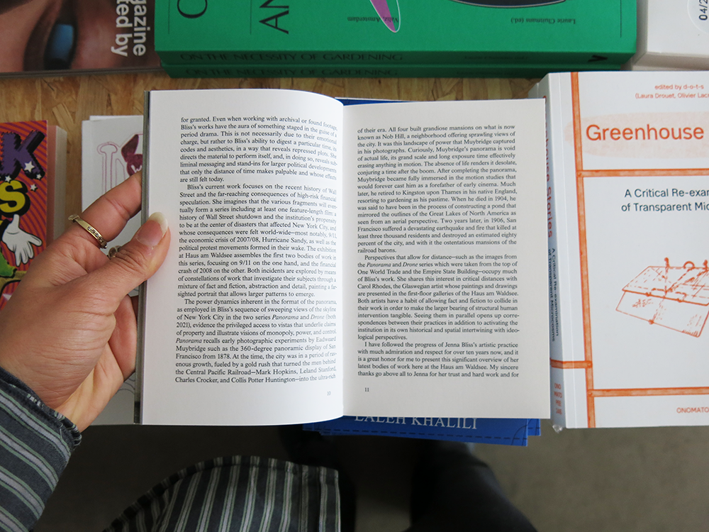 Jenna Bliss explores the political dimensions inherent in our ways of seeing and telling stories. In her practice, she primarily uses film, photography, sculpture, and collage. Her works are characterised by detailed research into often overlooked and marginal topics that nevertheless reflect major global events. Bliss employs research and intuitive associations to sift through collective memory, questions common assumptions, and thus expands an accepted narrative. For her first institutional exhibition in Germany, she brings together two of her most recent projects, which form part of a larger series of works around the recent history of Wall Street and the far-reaching consequences of high-risk financial speculation. These first two bodies of work in the series concentrate on the attacks of September 11, 2001, and the financial crash of 2008. Both events are examined in constellations of works that illuminate their subjects through a mixture of fact and fiction, abstraction and detail, drawing a wide-eyed portrait that reveals larger patterns. Through the montage of self-filmed, found, and archival footage in the form of text and images, Bliss elicits inherent ideologies from the material and reveals historical links that are invisible at first glance.