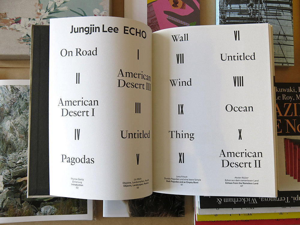 In the early 1990s, South Korean photographer Jungjin Lee travelled extensively across the endless expanses of the United States, where she captured archaic, primal images of deserts, rocks, undergrowth and cactuses. Drawing on her South Korean heritage, the artist developed a highly unique pictorial language through which she created specific series such as Ocean, On Road, Pagodas,Things and Wind, poetically exploring her fundamental interest in nature and culture. In her work, Lee taps her profound understanding for materiality, texture and craftsmanship. Working with Liquid Light, she applies photosensitive emulsion onto rice paper with a coarse brush. Echo presents eleven groups of works, contextualised in essays by Lena Fritsch, Hester Keijser and Liz Wells, providing – for the very first time – an overview of an oeuvre spanning two decades. The book is published on the occasion the exhibition at Fotomuseum Winterthur, September 17, 2016 until January 29, 2017. Spector Books (Leipzig).
